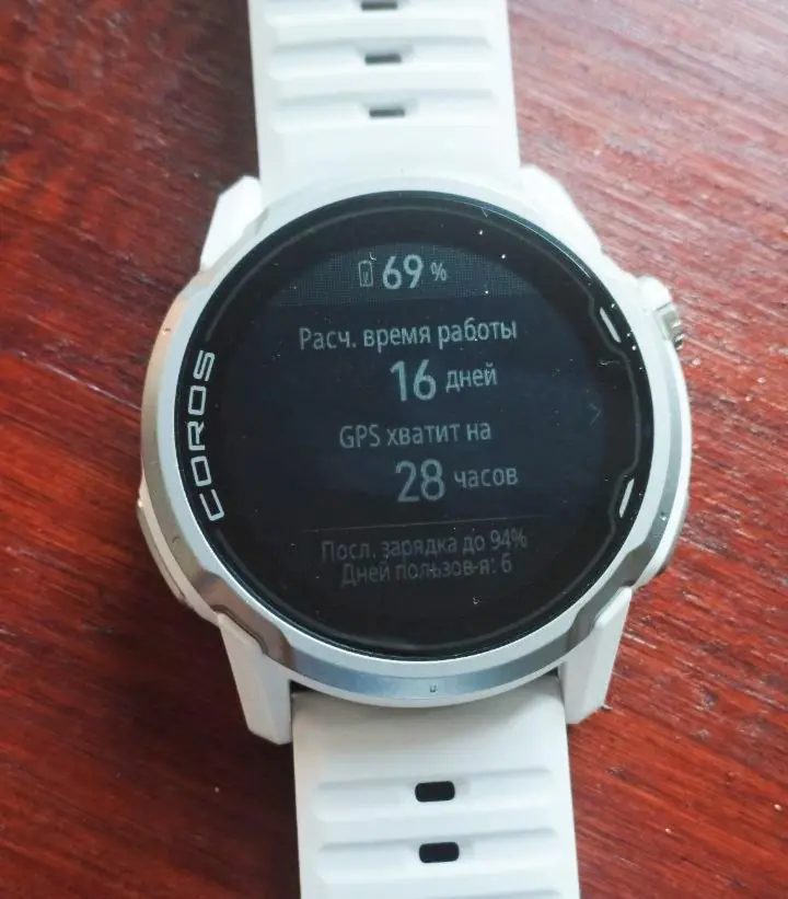 Часы могут подсказать, сколько запаса осталось, перейдя в меню и выбрав пункт "расход батареи", что очень удобно, когда перед тренировкой надо решить - стоит ли уже подзарядить или пока что хватит заряда.