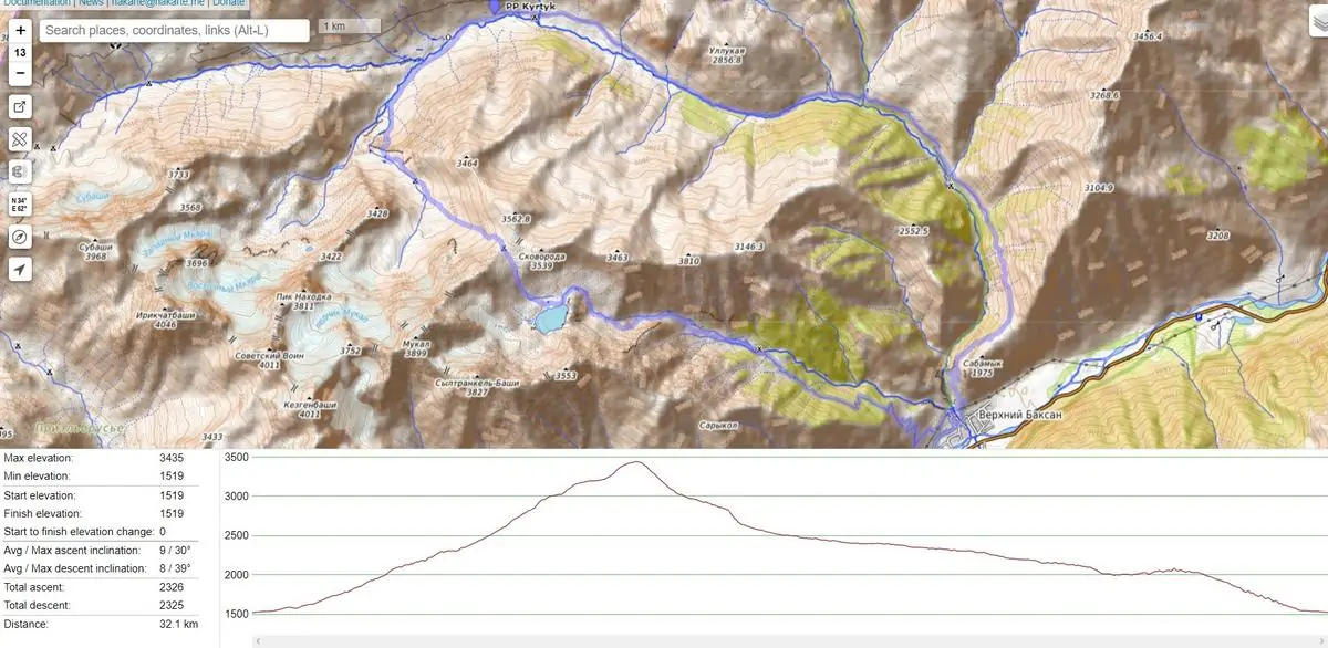 Скачать трек можно на странице гонки SYLTRAN 33. Маршрут стартует из Верхнего Баксана и представляет собой кольцевой трек, проходящий через первал Сылтран и ущелье Киртык. В целом, до 11.5 км дистанция всё время идет вверх, поднимаясь от 1500 м до 3400 м, а затем следует почти 20 км спуска по дороге с плавным сбросом высоты. Но обо всем по порядку.