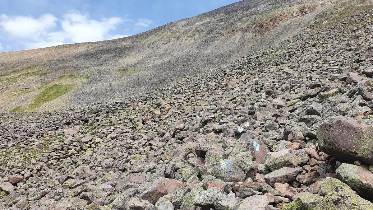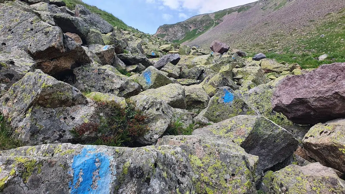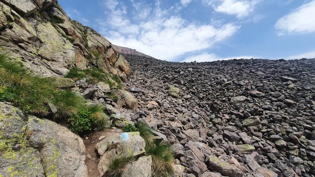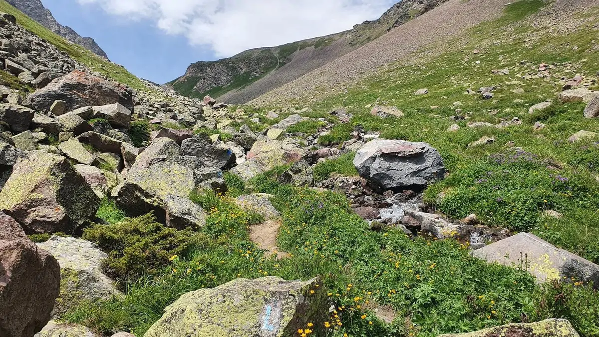 А дальше все становится серьезно! Высота уже под 3000 м, и мы попадаем в царство камней. Тропа проходит через участки крупного курумника, пересекает небольшой ручей, и затем снова круто идет вверх.