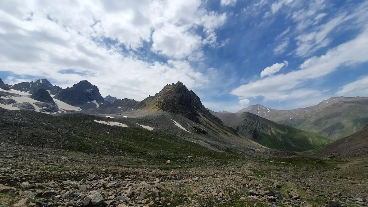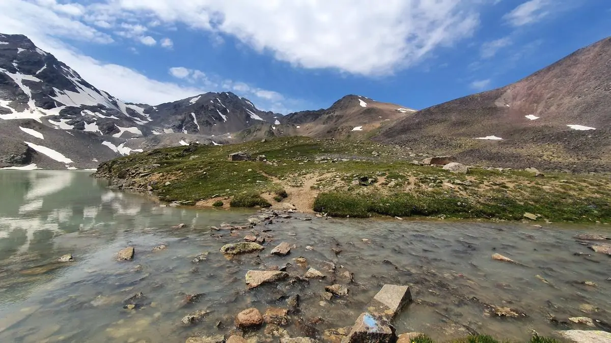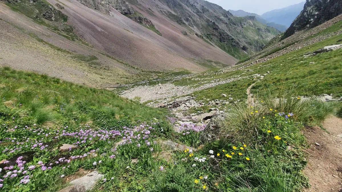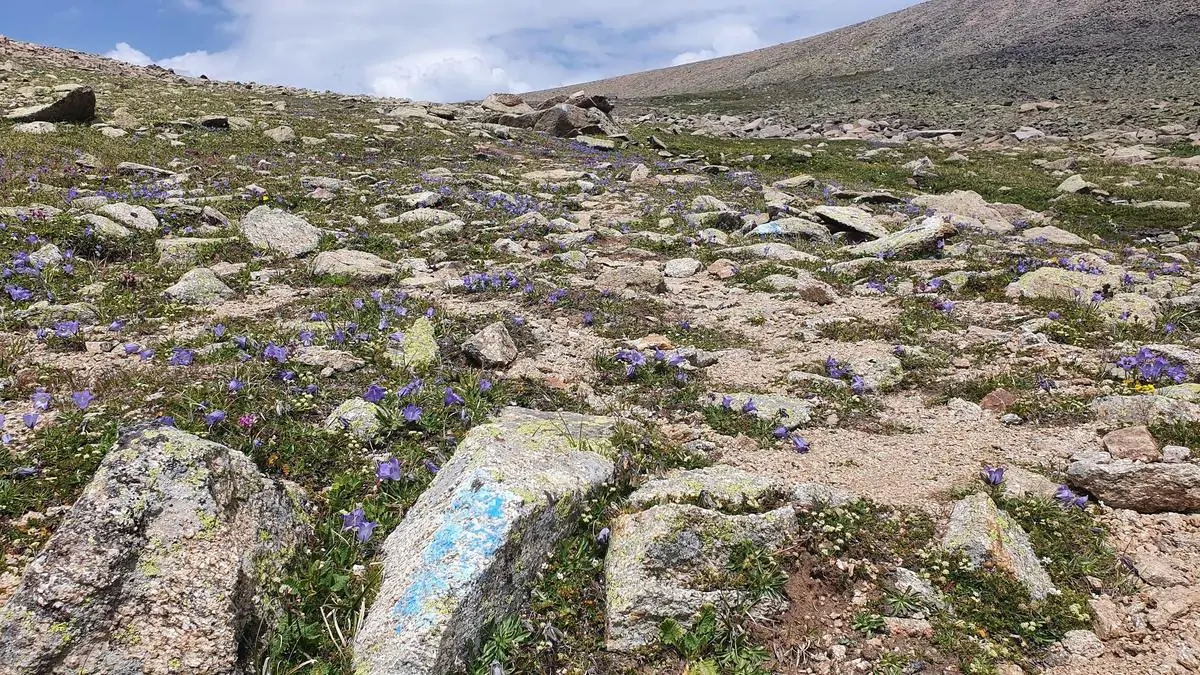 Перевал представляет собой обширное плато, на котором, к моему удивлению, было довольно много зелени и цветов — это на 3400 м! Сейчас активно таят снега, и почти все заполнено водой, поэтому приходилось прыгать по камушкам.