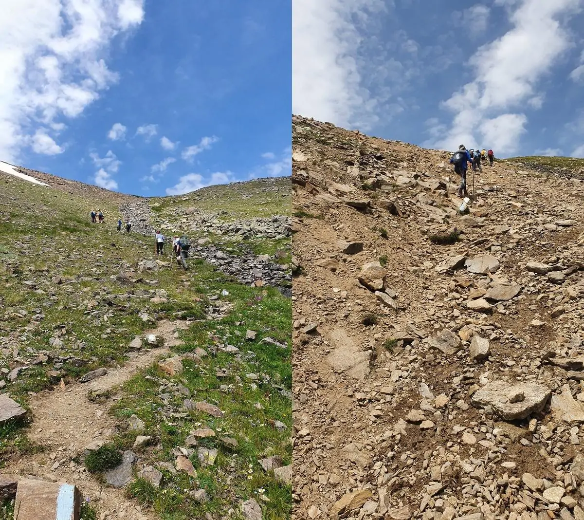 Подъём на перевал имеет достаточно крутой уклон. Поначалу тропа проходит по грунту, становясь затем полностью каменистой. Сухой грунт и мелкие камушки так и норовят увлечь вас за собой, поэтому внимательно смотрим под ноги и держим равновесие!
