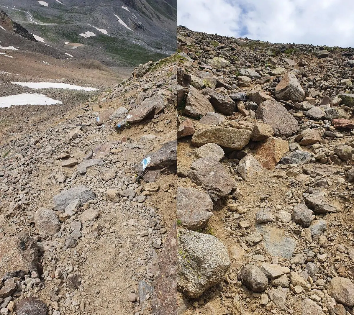 Первый километр спуска с перевала достаточно крутой и техничный, много мелкой и средней сыпухи, камней разных форм и размеров. Так вы спускаете примерно 200+ метров.