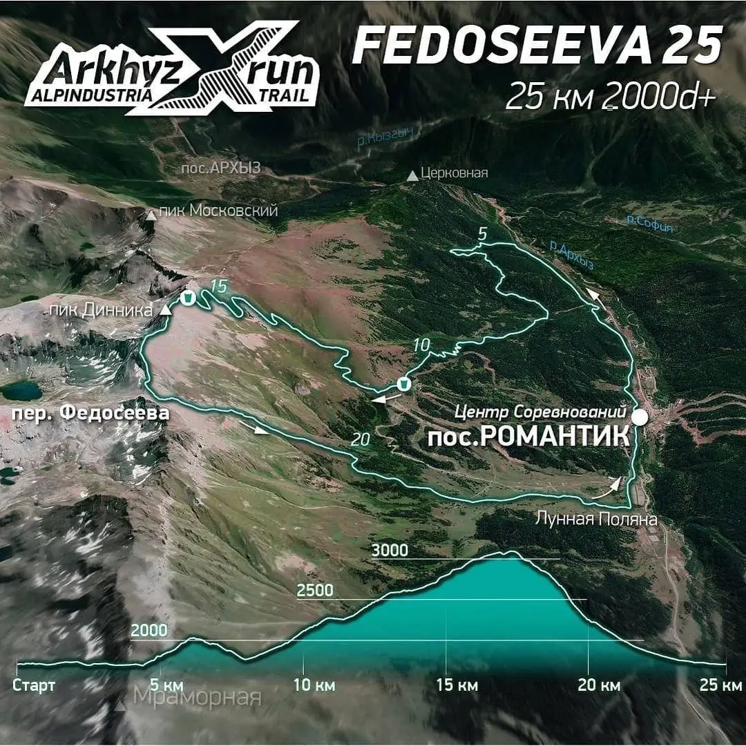 Первые 9 километров пройдут по дистанции ROMANTIK 12, с её дорогами и тропами по лесистым отрогам южного склона хребта Абишира-Ахуба. На 10-м километре участники короткой дистанции уйдут вниз на финиш, а вы продолжите гонку! На 11 километре (верхняя станция канатной дороги) — пункт питания. Далее затяжной подъем по живописной горной дороге мимо скальных останцев к перевалу Узловой на высоту 3060 м. Тут второй пункт питания и от него 2 километра очень красивой и техничной тропы по гребню хребта в сторону перевала Федосеева, в честь которого и названа эта дистанция. От перевала резкий сброс по тропе и дальше длинный дикий спуск по альпийским лугам почти по прямой до самой Лунной Поляны, второго кластера курорта Архыз, откуда уже до финиша рукой подать!