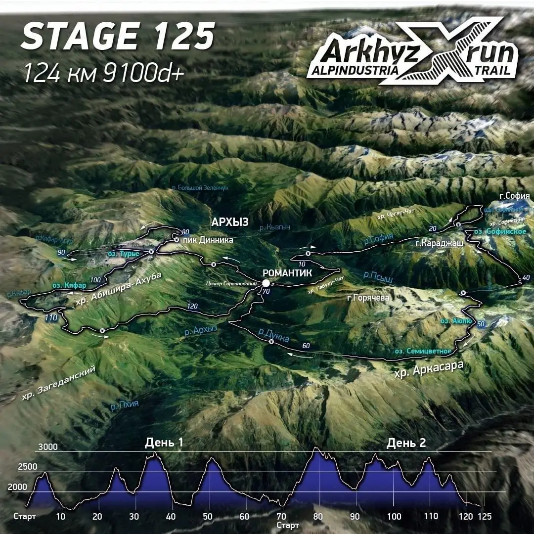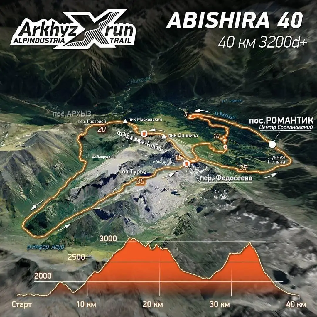 40 км с набором 3200 м, старт 4.07 в 5:30 утра с центральной площади курорта Архыз (пос. Романтик). Контрольное время 11 часов.