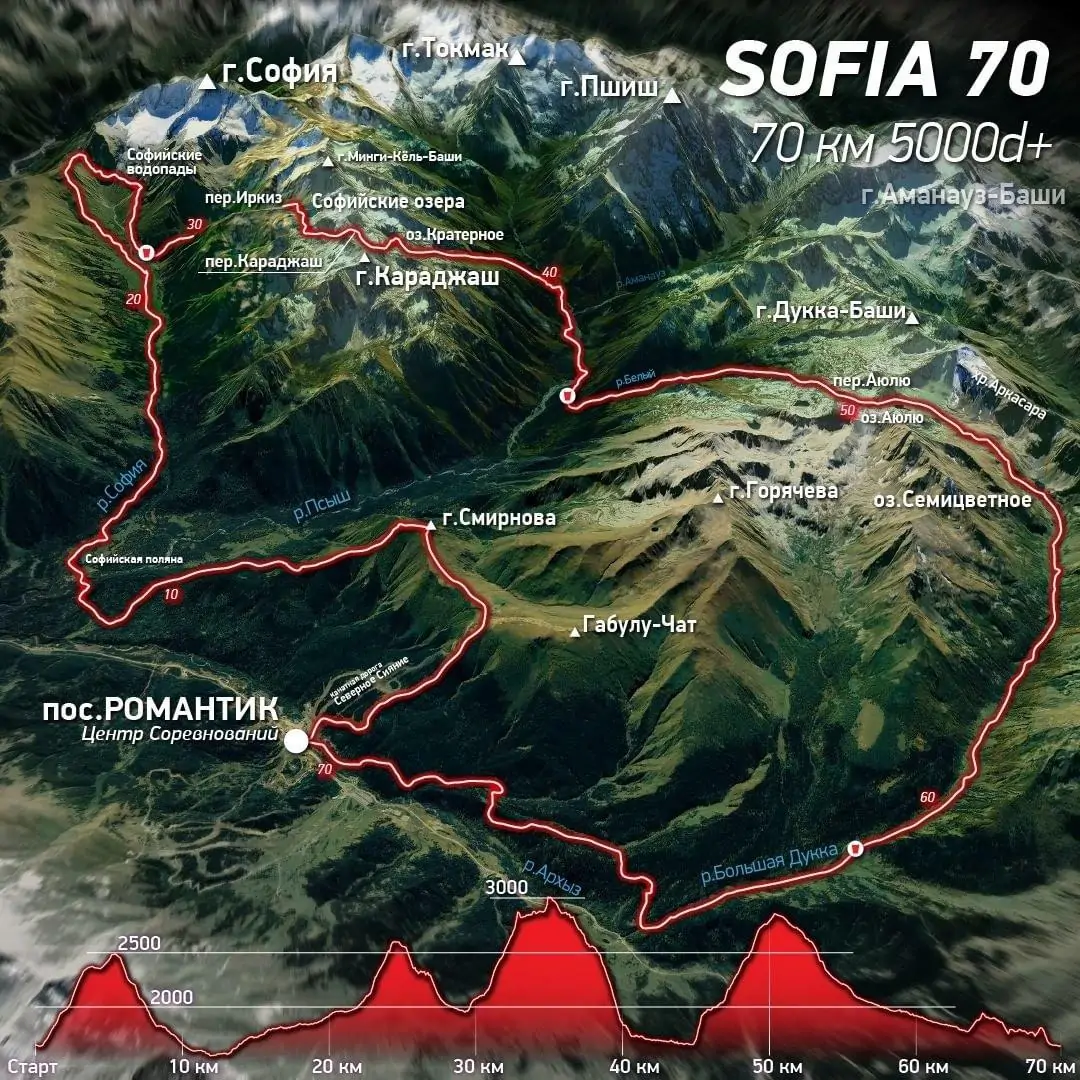 В отличие от дистанций 12, 25, 40 и 55, расположенных к северу от долины р. Архыз и проходящих по хребту Абишира-Ахуба, кольцевая дистанция SOFIA проложена к югу от Романтика по долинам рек София, Псыш, Дукка и Архыз и горным хребтам между ними.