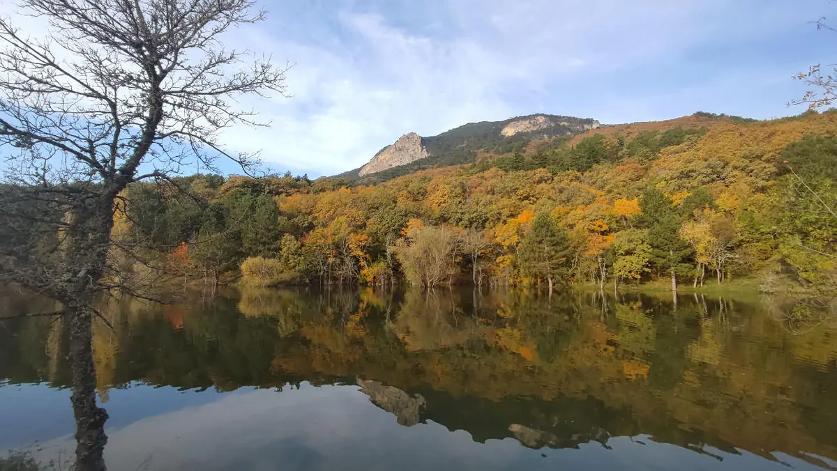 Вперёд особо не рвался. Набор был постепенный, с плоскими отрезками. По пути запомнилось одно озеро. Очень красивое! Кстати, я на этой гонке часто останавливался и снимал. Просто, ну очень красиво в Крыму осенью. Хотелось жить именно в этом мгновении и по-максимуму все запомнить, впитать.
