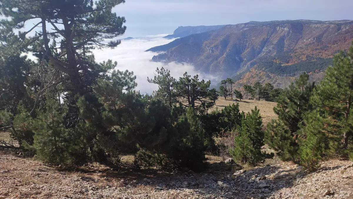 Финальный взлет на яйлу был ну очень уж крутой, вниз лучше не смотреть, чтобы голова не закружилась. В конце подъёма, как раз, и вышли из пелены облаков.