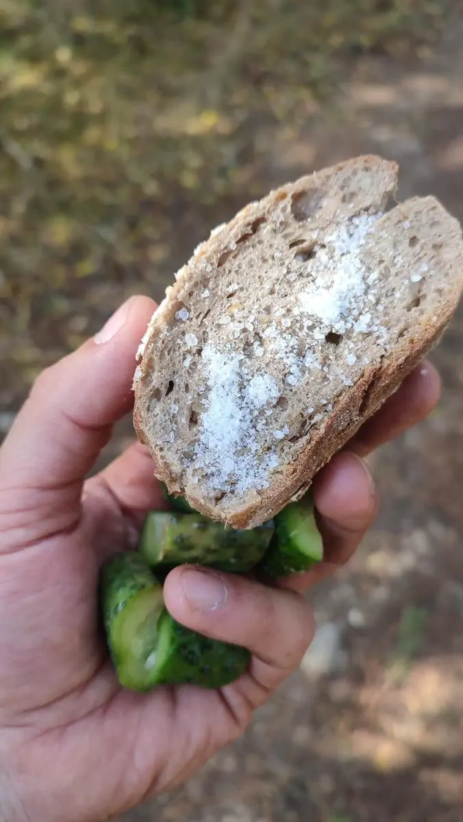 На пункте напился воды и изотоника и... Учитывая, что у меня не было солевых таблеток, а вчера уже были предпосылки к судорогам, то решено было пополнить электролиты легендарными солеными огурчиками, изготовленными по специальному, содержащемуся в тайне, рецепту. К огурчикам я добавил еще черный хлеб с солью. Старожилы говорят, что так раньше марафоны бегали!