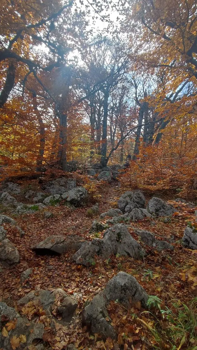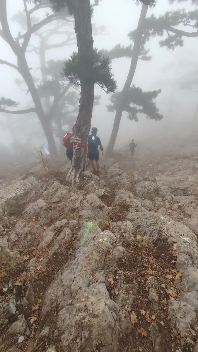 Подбежал к началу подъёма на смотровую Ай-Петри, тут уже все было в облаках и лес, который там находится стал ещё более волшебным и... опасным. Камни, много камней, покрытые слоем осенних листьев и все это сдобрено влагой от облаков. Очень опасная смесь. И нужно ли говорить, что камни буквально отполированы до блеска миллионами ног туристов за десятилетия.