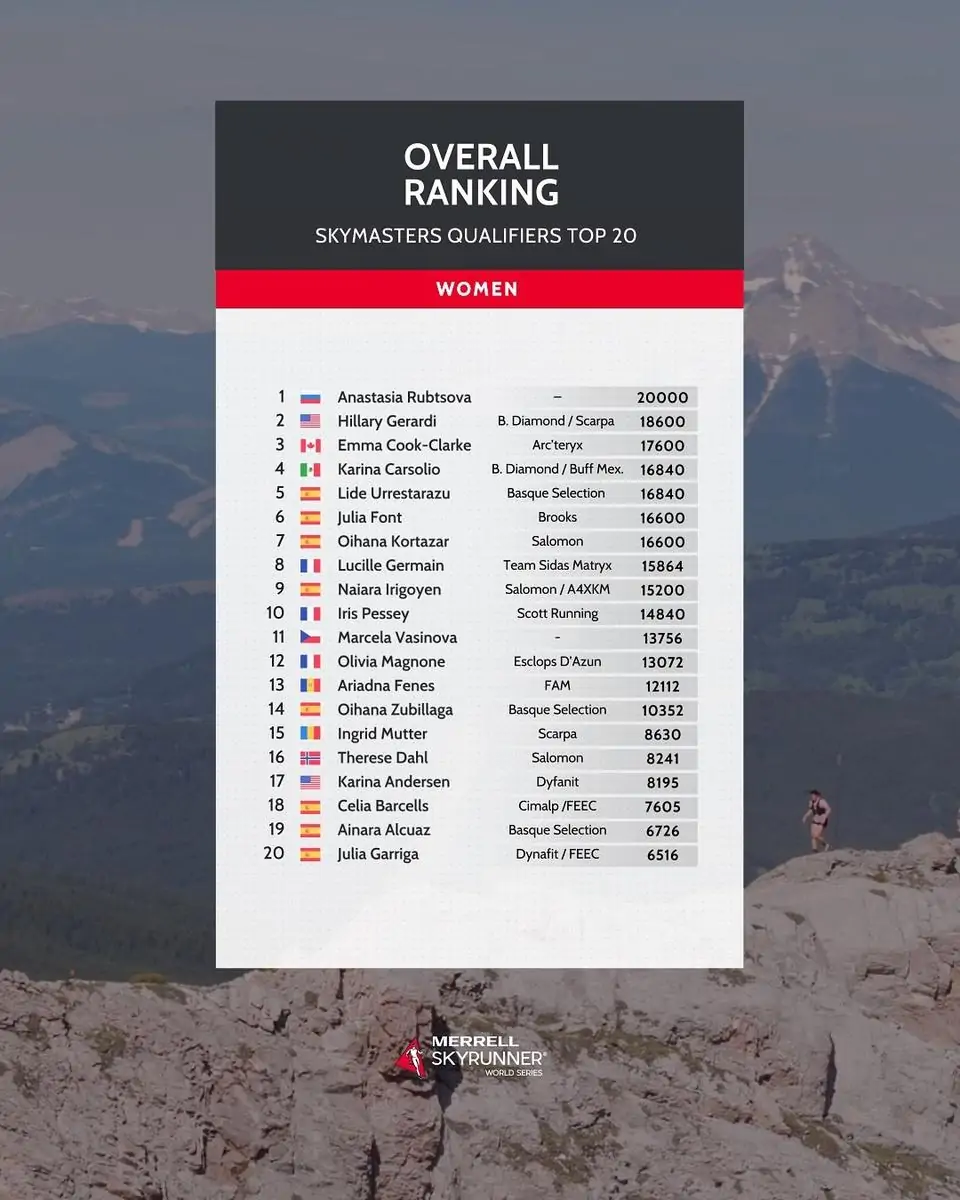 Среди женщин несомненным лидером была наша Настя Рубцова (первое место в рейтинге), за ней следуют Júlia Font из Валенсии (Brooks Running), Karina Carsolio из Мексики (B.Diamond/Buff Mexico), канадка Emma Cook-Clarke (Arc’teryx), Lucille Germain из Франции (Sidas Matryx), Hillary Gerardi из США (B.Diamond/Scarpa), Lide Urrestarazu из Испании (Basque Selection), Oihana Kortazar из Испании (Salomon), Cèlia Balcells из Испании (FEEC), Olivia Magnone из Франции (Esclops d’Azun), Iris Pessey из Франции (Scott Running), и чешская атлетка Marcela Vasinova.