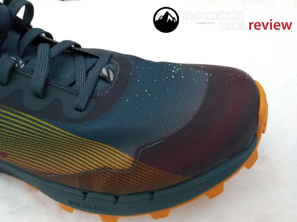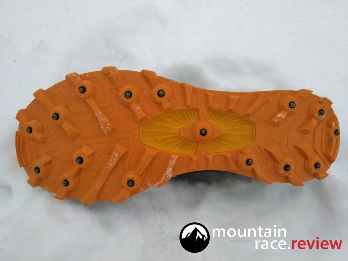 Узор грунтозацепов лучами расходится от единственного шипа в центре подметки. Это реализует хорошее схватывание кроссовок на сильно пересеченной местности с эффективным сбрасыванием грязи с подошвы. Переменная высота выступов до 5 мм помогает сцеплению на мягких и рыхлых поверхностях, но на крутых заснеженных и грязных подъемах начинает появляться заметное пробуксовывание.