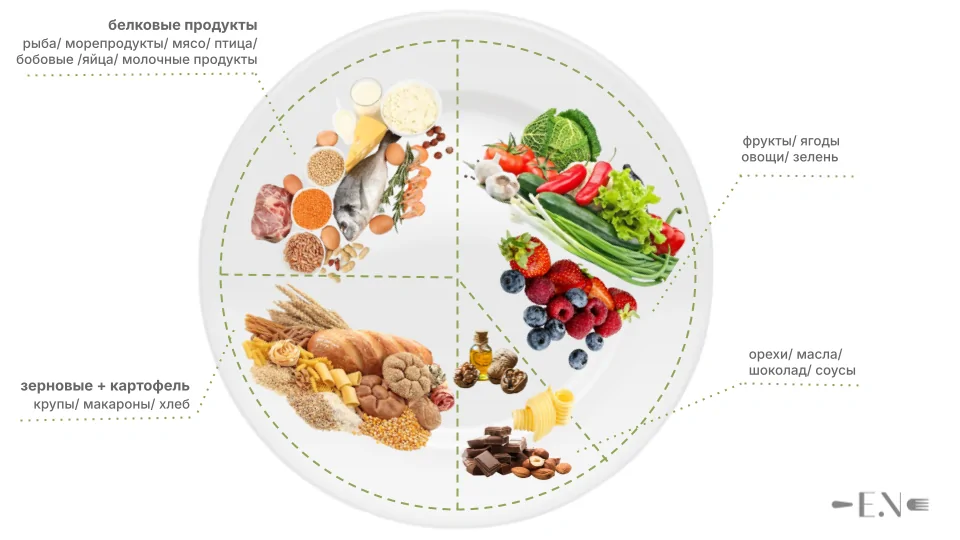 Идея в том, что именно тарелка служит визуальным ориентиром по каждому компоненту: белковому, жировому и углеводному.