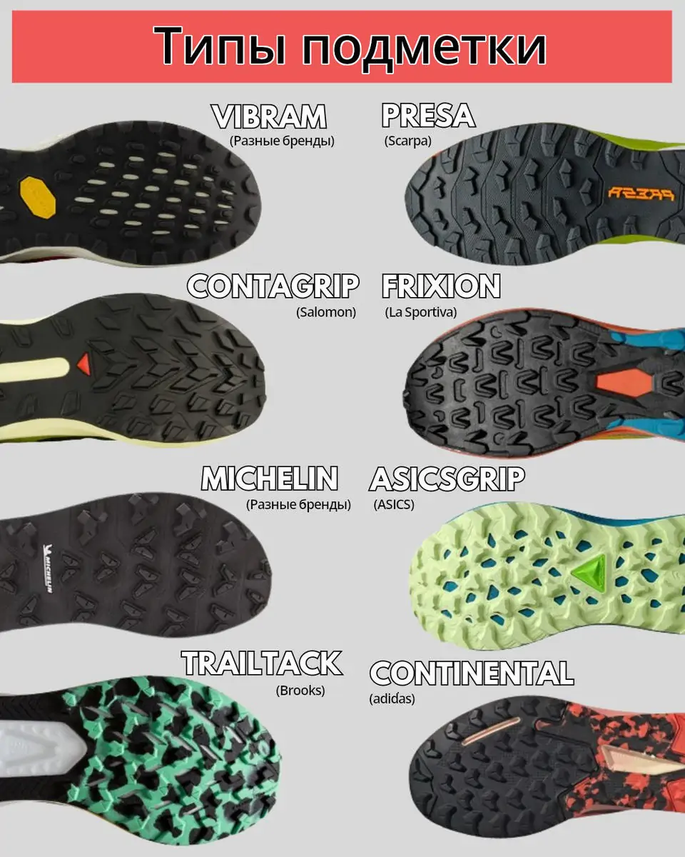 Почти все крупные бренды имеют свои наработки и запатентованные марки. Так, некогда трейловый бренд N1, Salomon всегда был известен вариативностью рисунков подошвы Contagrip. Вообще, можно считать их законодателями моды и самыми плодовитыми на рисунки протекторов. Их кредо — постоянно создавать что-то новое, а не перевыпускать старое. Что, конечно, создаёт проблемы новичкам, равно как и рабочие места консультантам в магазинах, — кто-то же должен разбираться и знать, как выбрать нужную подошву.
