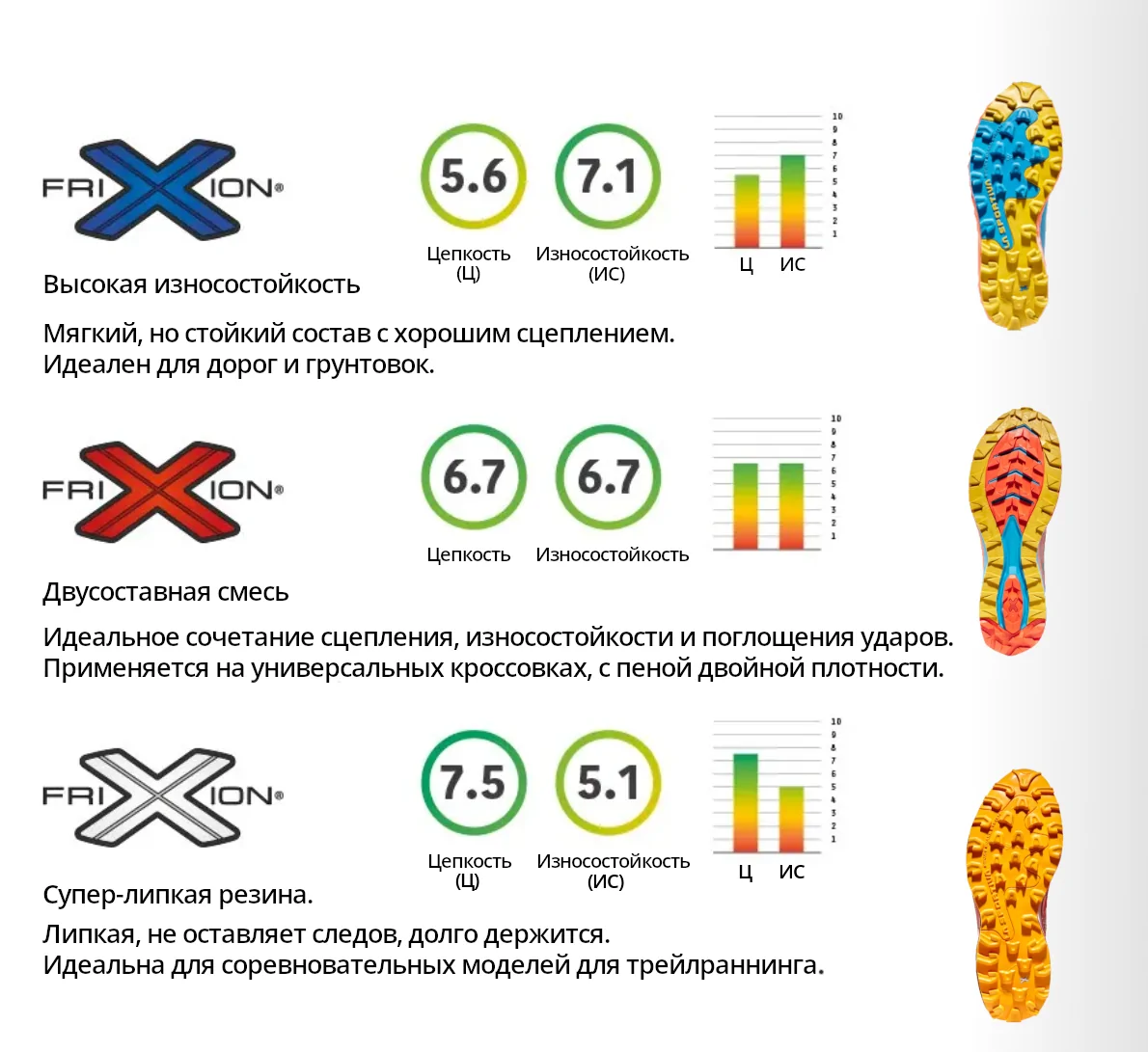 Другой итальянский дом турбо-моды La Sportiva имеет диаметрально противоположный концепт: «Работает — не трогай» и десятилетиями выпускает модели с однотипными рисунками и редкими изменениями, используя бренд Frixion. Лишь в последние пару лет они явно наняли креативного дизайнера, и в линейке беговых кроссовок появилось много новых моделей и подметок, соответственно.