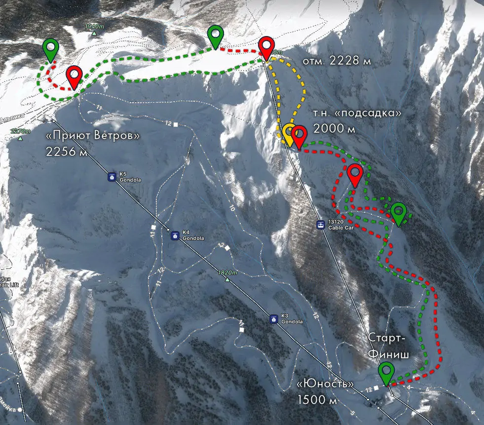 Красный пунктир — линия спуска. На местности она обозначается красными флажками и может проходить как по подготовленной трассе, так и вне её. Между подъемом и спуском транзитные зоны, где снимается или надевается камус на лыжи.