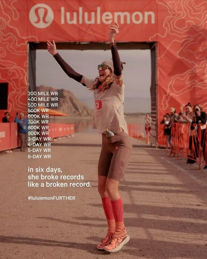 Lululemon, канадо-амриканский бренд, производящий спортивные товары, объявил около года назад о событии FURTHER. Это 6 дней бега для 10 специально выбранных женщин-амбассадоров, которые должны были отодвинуть границы возможностей человеческого тела. Забег стартовал 6 марта в La Quinta, Калифорния.
