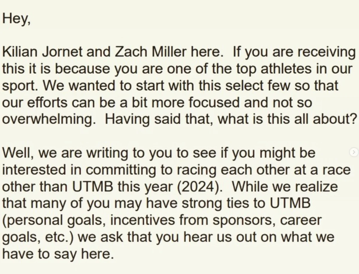 В письме Килиан и Зак, признавая исключительность и великолепную организацию UTMB и её значение для мира трейлраннинга, предлагают всё же не участвовать в гонке 2024 года. Они говорят о том, что, хотя любая гонка - это бизнес, но организаторы UTMB должны научиться вести его правильно. И в первую очередь задаваться вопросом “Что мы можем сделать для того, чтобы улучшить мир трейла”, а не “как нам получить больше выгоды”.