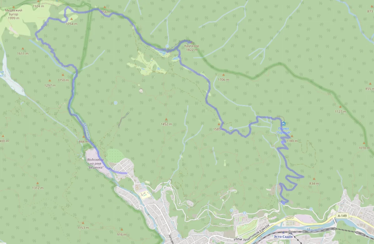 Один из моих самых любимых маршрутов в Красной Поляне это маршрут на Хмелёвские озёра со спуском вдоль реки Бешенки длиной 17 км и набором высоты 1400 м. Маршрут одинаково удобен как для беговой тренировки средней продолжительности, так и для похода выходного дня. Старт маршрута находится прямо посреди дороги между посёлком Красная Поляна и Эсто-садок.