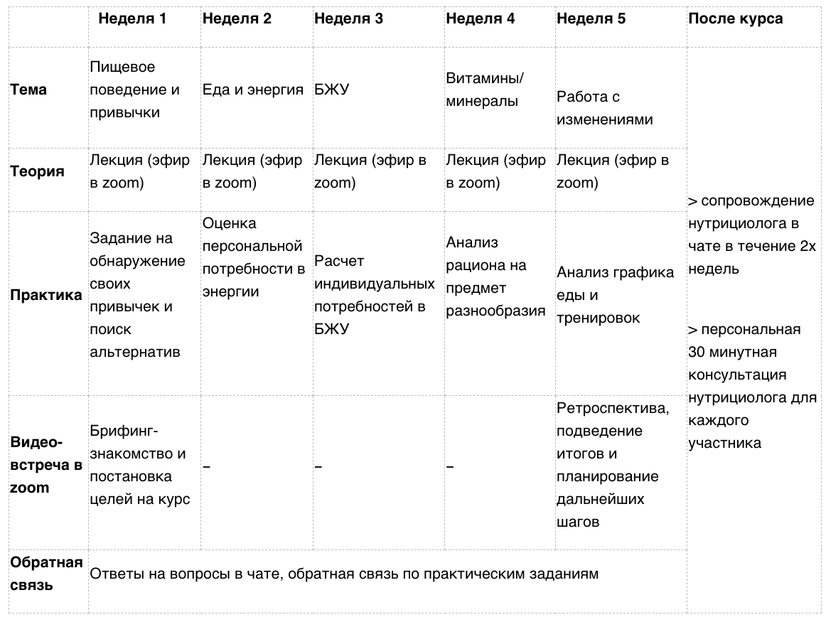 Разработка нутрициологом индивидуальных рационов для каждого участника, а также проверка персональных дневников питания не предполагается.
