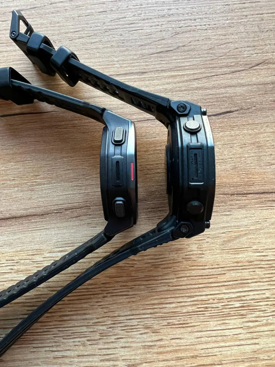 Обе версии выглядят довольно брутально и их смело можно охарактеризовать как outdoor-часы. Корпус рассчитан на то, что, возможно, с ним будут не особо аккуратны из-за условий эксплуатации. Зимой кнопки легко нажимаются в перчатках, титановый безель и сапфировое стекло защищают от царапин. В обоих часах есть микрофон и динамик для ответов на звонки по Bluetooth.