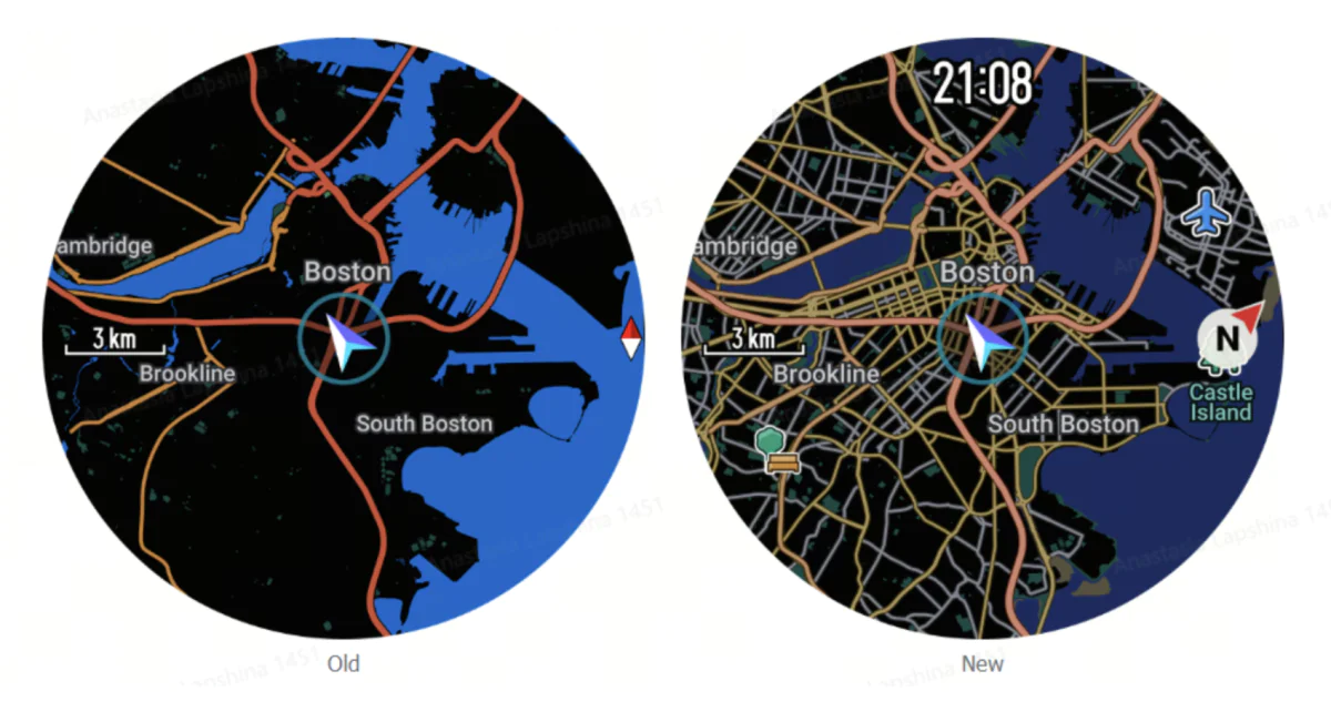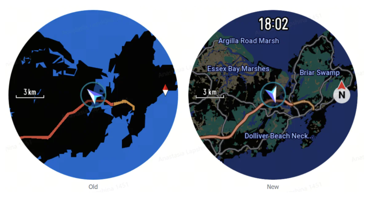 С точки зрения встроенных карт в меньшей модели все в точности также как и в старшей. Разница в реальном использовании: 48 мм удобнее для просмотра карт и навигации, а 44 мм чуть плотнее по картинке из-за более высокой плотности пикселей, но информации на экране физически меньше.