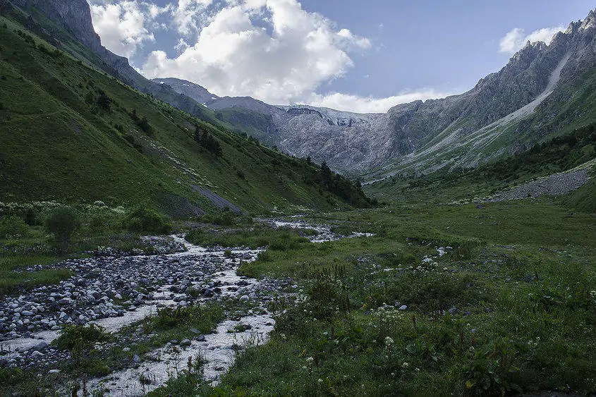 Старт чуть выше новой парковки между Азау и Терсколом. Подъем по каменистой тропе, местами разрушенной по ущелью Гарабаши, спуск по грунтовым дорогам горнолыжного курорта Эльбрус. Подробно маршрут описан здесь: Гарабаши 10 км: фотоиллюстрация трека.