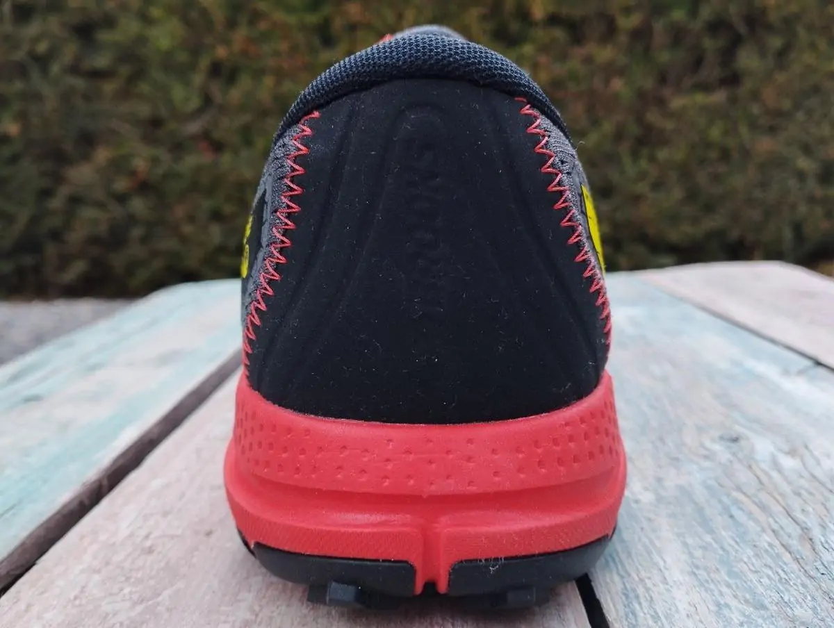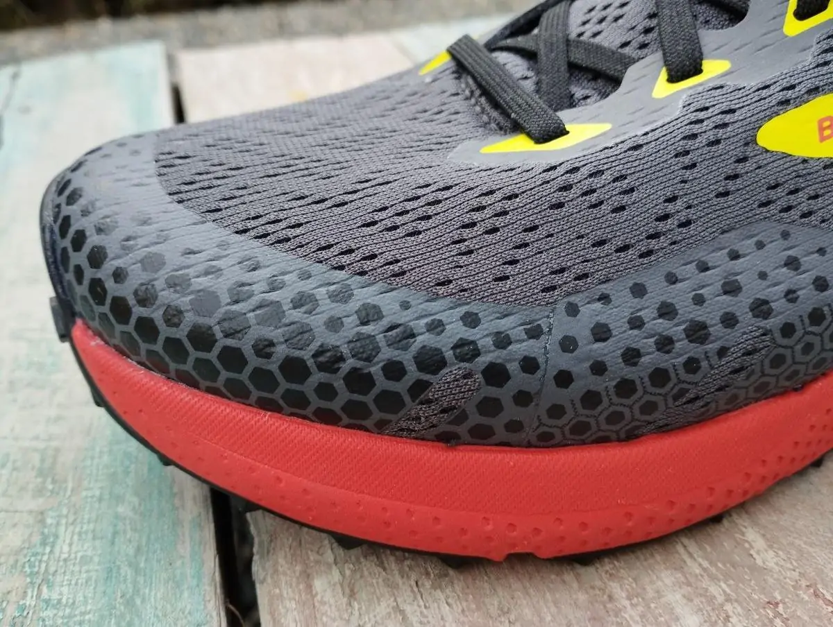 Чем еще мне понравились кроссовки, кроме геометрии подошвы, так это очень мягким комфортным верхом, довольно широким в передней части и напоминающим бабушкин шерстяной носок по уровню комфорта - двухслойная сетка верха к тому же неплохо защищает от пыли и крупного песка, грунта. При беге вниз по крутой горнолыжке пальцам здесь просто некуда выткаться - мысок лишен жестких элементов, а защитная ламинация очень небольшая по площади в передней части. Кроме того, чашка пятки твердая и плотно обхватывает голеностоп, а дополнительные дырки для шнуровки позволяют достичь еще большей фиксации для тех, кому это нужно (мне - да).
