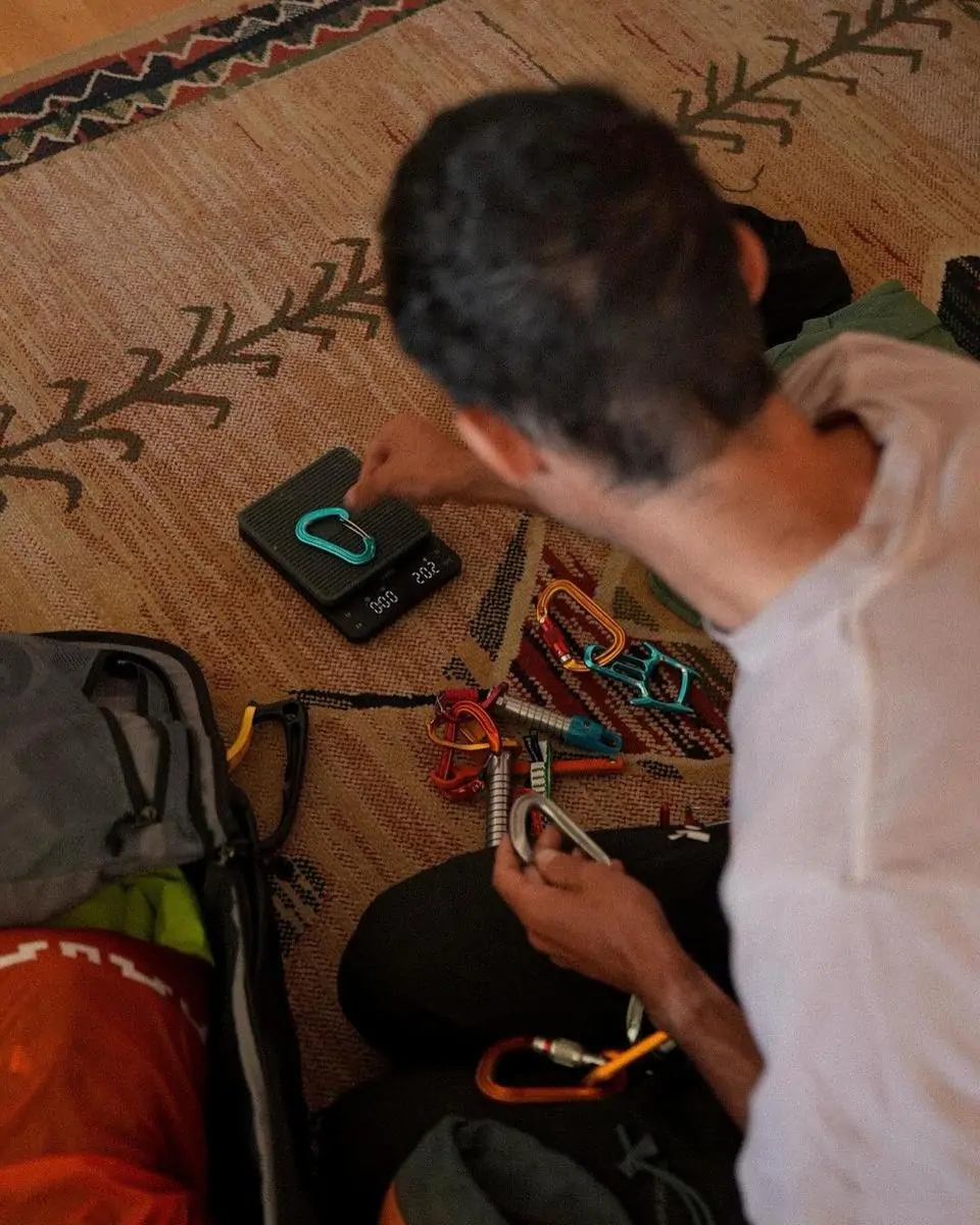 Кроме очевидно Лембасов с корицей и GoPro, в рюкзаке переносилось и альпинисткое снаряжение — страховочная обвязка Camp, кошки, железо, веревка, ледовые крючья, скимо-каска, палки. Интересно, что на одном из ледовых крючьев красуется надпись NNormal, как и на вело-шлеме и альпинистской каске. Очевидно, что у Килиана сейчас нет спонсоров, и он испльзует просто топовое снаряжение без опозновательных знаков, которое сходу не идентифицруешь. Но палки Leki, весом около 200г предположительно собранные из разных деталей на базе модели Cross Trail FX . А вот фонарь от кастомной норвежской фирмы Moonlight модель вероятнее всего Bright as Day 800.