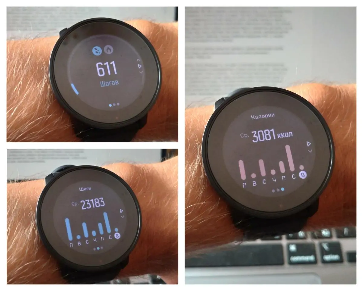 Далее исследователь часов обнаружит то, что ищет в спортивных часах большинство людей - шагомер, работающий на акселерометре, а также счетчик калорий - также очень востребованный инструмент. Нужно отметить, что улучшенный наручный датчик ЧСС в теории и калории должен считать точнее. Здесь же можно найти количество шагов в разрезе недели с разбивокой по дням, то же самое по калориям и средние значения соответственно. Вообще очень удобная и легкодоступная статистика. Зная свой примерный расход калорий, могу сказать, что данные весьма правдивы, особенно если сравнивать их по дням, анализируя гистограммы длинных горных тренировок и забегов. Это в нужный момент лично мне напоминает, что пора поесть, хотя многим наоборот =)