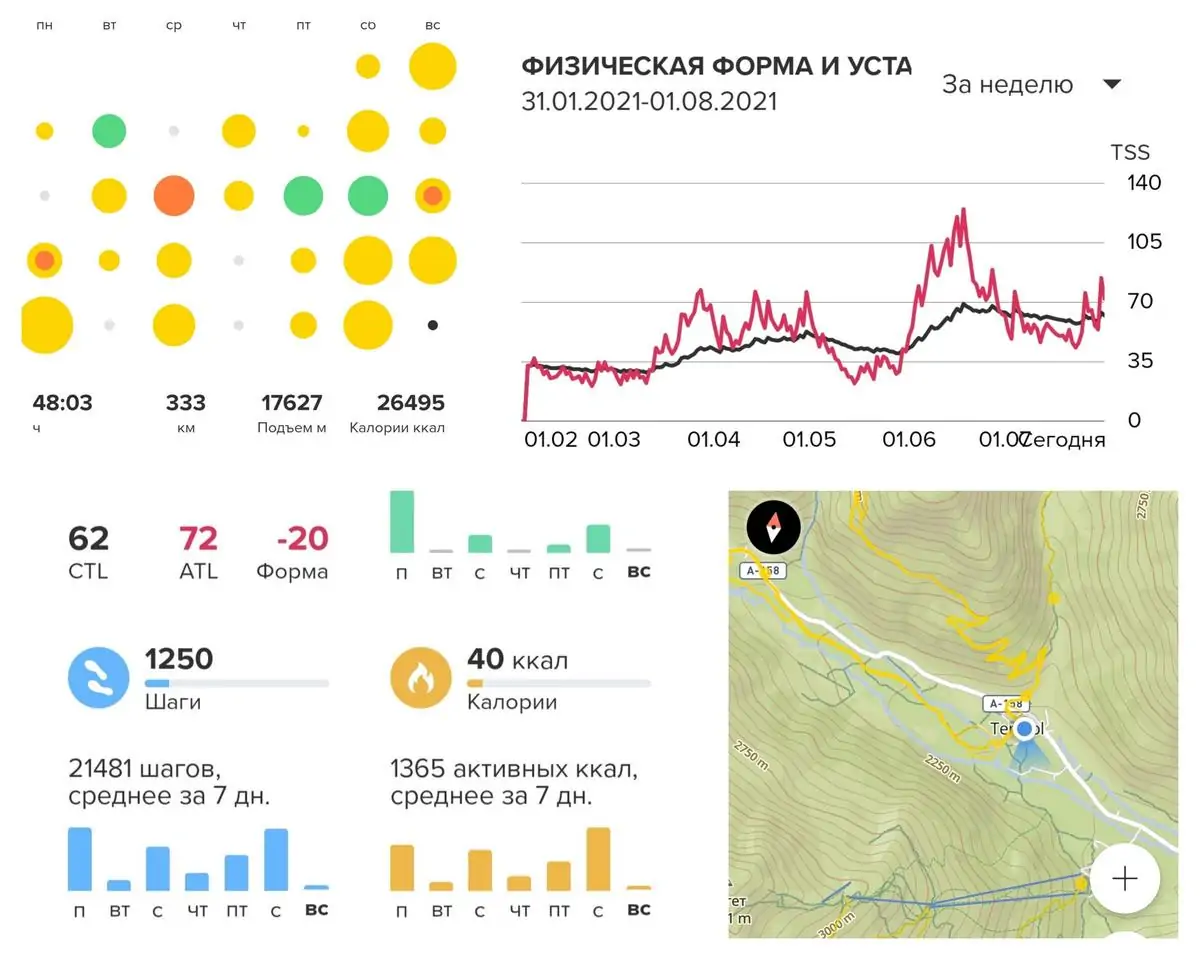 Далее по меню, на наш взгляд, самая важная аналитика для тренирующихся людей - это недельный объем тренировок в часах с разбивкой по дням ввиде гистограмм и графиком роста средних значений. Вся эта аналитика в более подробном виде выгружается в личный аккаунт приложения Suunto, добавленная аналитикой от Training Peaks. Вообще объединение экосистем TP, Strava и Suunto выглядит вполне добротно сделанной, перекрестные выгрузки работают очень быстро, а для любителей анализировать это и вовсе хорошее подспорье, особенно для тренеров, работающих с учениками дистанционно. Метрик, которые могут рассказать о ходе тренировки и здоровье подопечного более чем достаточно. Но тут уже действительно нужно следить, чтобы данные ЧСС писались корректно, тогда и вся аналитика с ее алгоритмами будет выдавать релевантные значения. Будучи консерватором во многих вещах, текущая экосистема, которая обновляется прямо на глазах, лично мне, как спортсмену, кажется весьма занятной, интересной и удобной, хотя год назад, возможно, я бы думал иначе. Все таки “юзерфрендли” интерфейс способен заинтересовать даже такого старовера, как я. И это как раз заслуга разработчиков программного обеспечения.