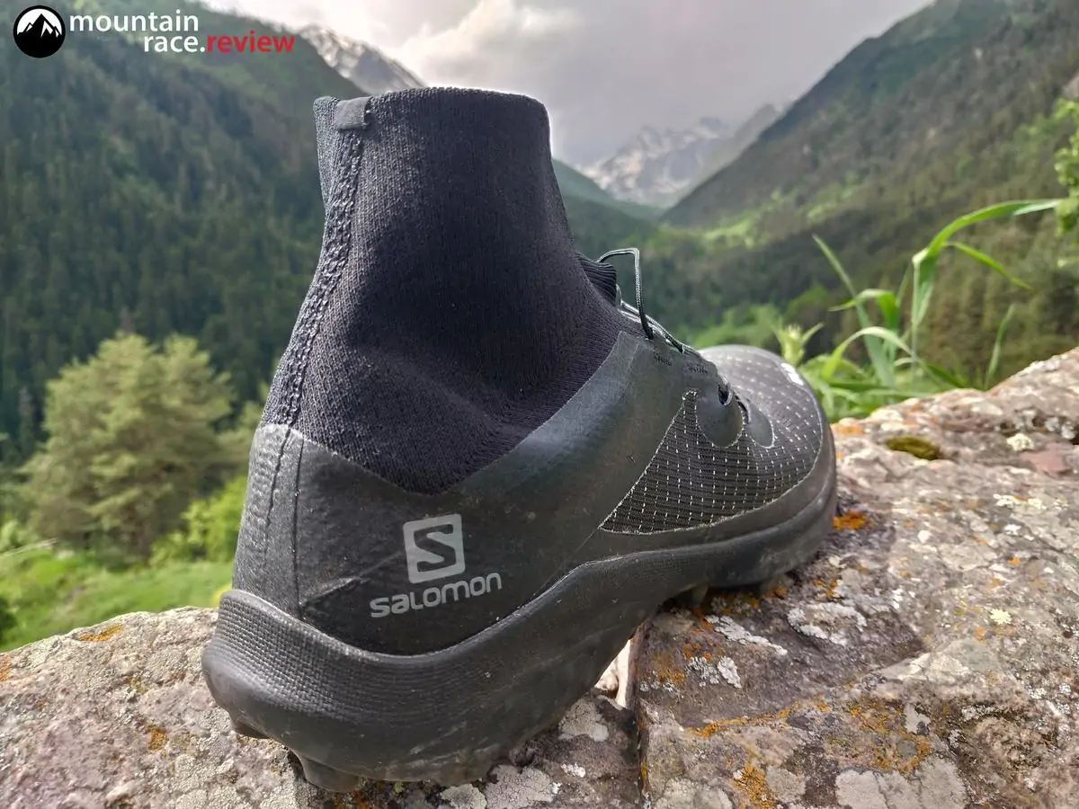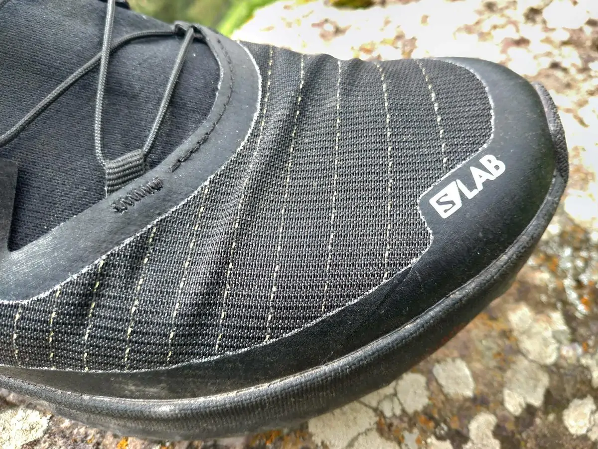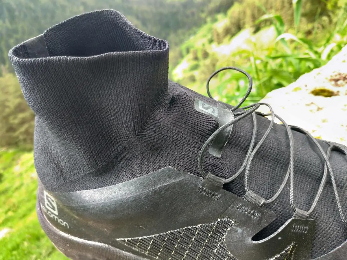 Быстрая система шнуровки Quick Lace. Ход шнурка довольно свободный. Перед технически сложными спусками стоит проверять степень затягивания. Стоит отметить весьма компактный кармашек, нашитый поверх носка для убирания шнурка внутрь. Он намного меньше типичных для Salomon, что опять подчеркивает стремление разработчиков к оптимизации всего, что можно оптимизировать. Шнурок там сидит очень плотно, не вываливается. Под шнуровкой во внутренней части первого слоя имеется продольная подушечка, которая препятствует давлению шнуровки на подъем стопы. Это решение прослеживается во всех новых топовых кроссовках S/Lab, и это правильное решение, учитывая специфичную узкую посадку |