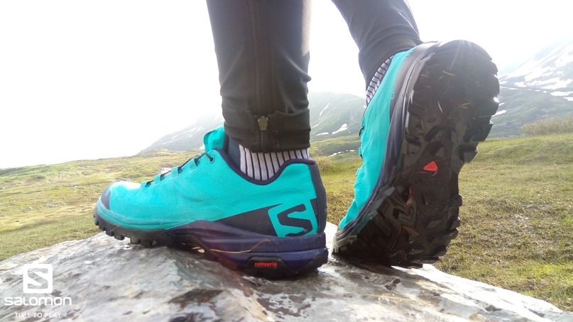 Первое, на что обращаешь внимание при носке, кроме яркого цвета (есть варианты менее яркие), это подошва. В отличие от кроссовок для трейлраннинга, она имеет более жесткую резину. Состав Premium Wet Traction Contagrip более близок к ботинкам для альпинизма, что делает их наиболее цепкими и устойчивыми на камнях. В течение похода собирал множество камней на спусках, чтобы проверить — не скользят, в том числе, когда подошва мокрая от воды. Жду возможность опробовать на мокром курумнике, т.к. по идее модели они и его должны держать хорошо. Кстати, и сам рисунок протектора близок к обуви Salomon для альпинизма.