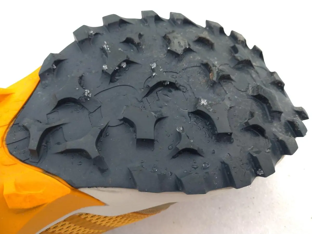 Протектор (Outsole) Рисунок протектора очень похож по геометрии на Wildcross, что не удивительно, ведь это одна линейка. Это грунтозацепы, которые работают на зацеп во всех направлениях, что важно на жидкой грязи и снежной каше. Такой рисунок объективно повышает стабильность опоры и препятствует скольжению, например, вбок. Однако, отличие в протекторе есть - в Madcross больше пятно контакта, что дает им возможность лучше пережить твердые участки грунта или асфальта, пока их хозяин бежит от дома до парка. Такой протектор более устойчив к истиранию, соответственно и более долговечен. Расстояние между грунтозацепами, соответственно меньше, а значит и очистка от грунта чуть хуже, чем в Wildcross, хотя начинающий трейлраннер все равно не в силах оценить разницу, она действительно не слишком большая. Кроме того, производитель заявляет отличный от Wildcross состав резины - Contagrip TD вместо TA - он более плотный. Что в целом также трудно оценить по ощущениям, ведь и сами грунтозацепы стали существенно шире. |