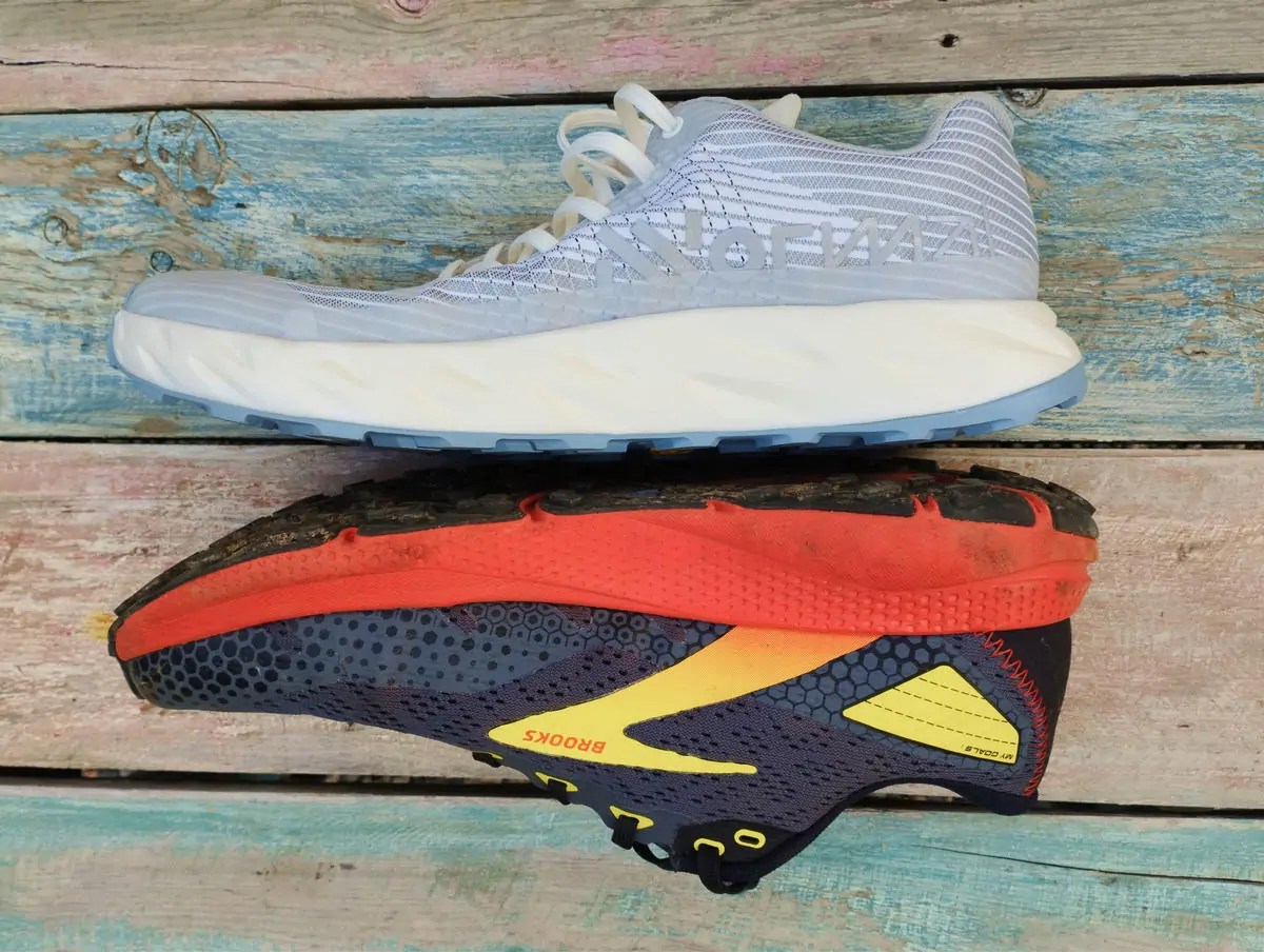 У моделей из совершенно разных категорий — NNormal Kjerag и Brooks Divide — оказалась очень схожей геометрия подошвы. А вот ощущения внутри совсем разные.