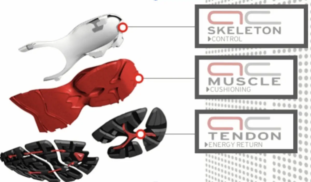Важнейшая конструктивная особенность этой модели — подошва Agile Chassis, то есть состоящая из нескольких элементов карбоновая (визуально) пластина AC Skeleton практически по всей поверхности подошвы (кроме мыска) + умеренно амортизирующая межподошва TPU - AC Muscle.