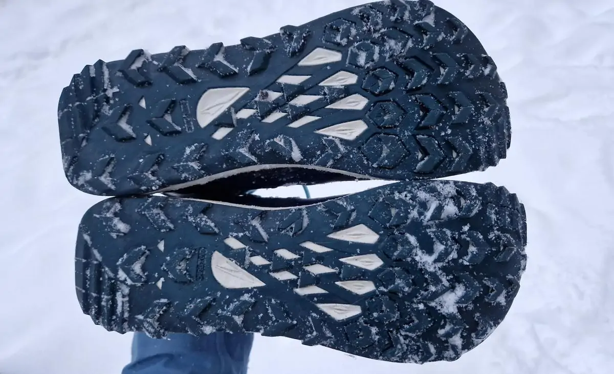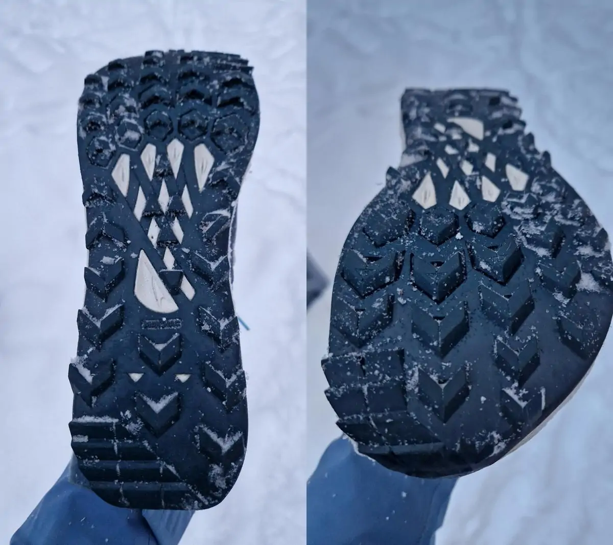 Как только надеваешь их первый раз дома или в магазине, то сразу чувствуешь, как будто ноги прилипают к полу. Примерно то же происходит и на улице. Шевроны-стрелочки оставляют четкий след на снегу, прям вгрызаясь в него. Шипы расположены по всей площади подошвы, и думаю, что для снежных условий это большой плюс, так как мы получаем больше площади опоры и лучше сцепление.