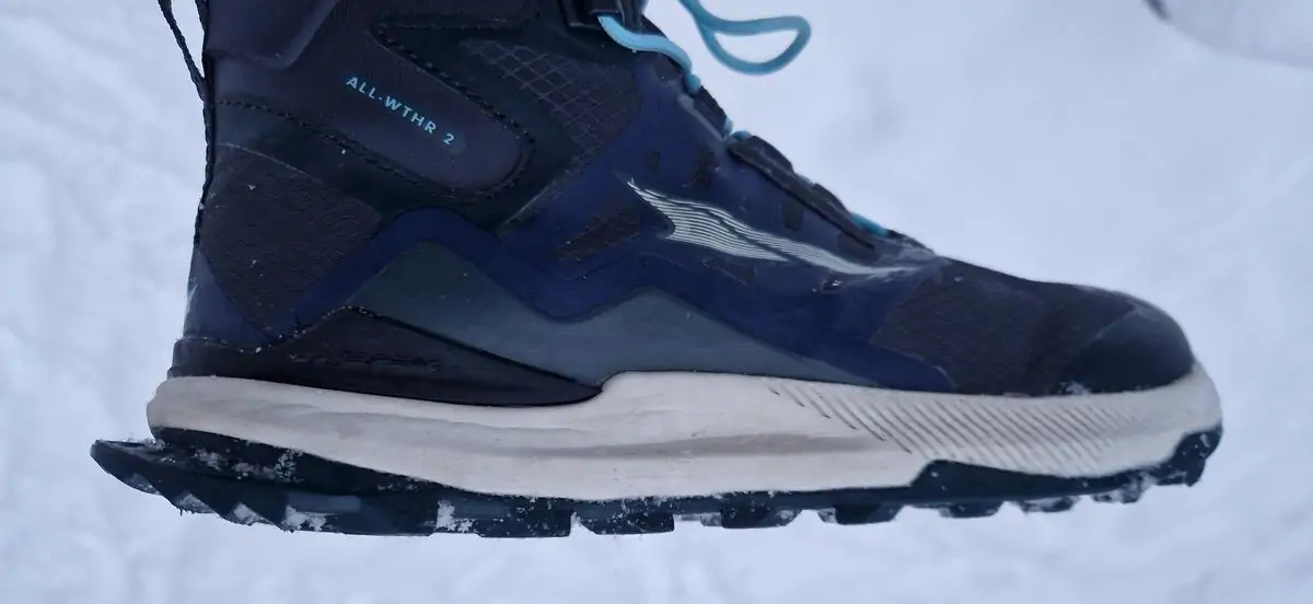 Основой для этой модели послужили Altra Lone Peak — тот же протектор, практически идентичный верх, только добавились мембрана и высокая манжета. Низкий вес и высокая гибкость подошвы позволяют совершенно забыть о том, что на ногах почти ботинки, а не беговые кроссовки. Пара пробежек по грунту, а затем по заснеженному городу заставили меня твердо поверить в то, что это отличные и даже идеальные (для меня!) кроссовки для зимних тренировок. И, похоже, для прогулок придется искать что-то другое.