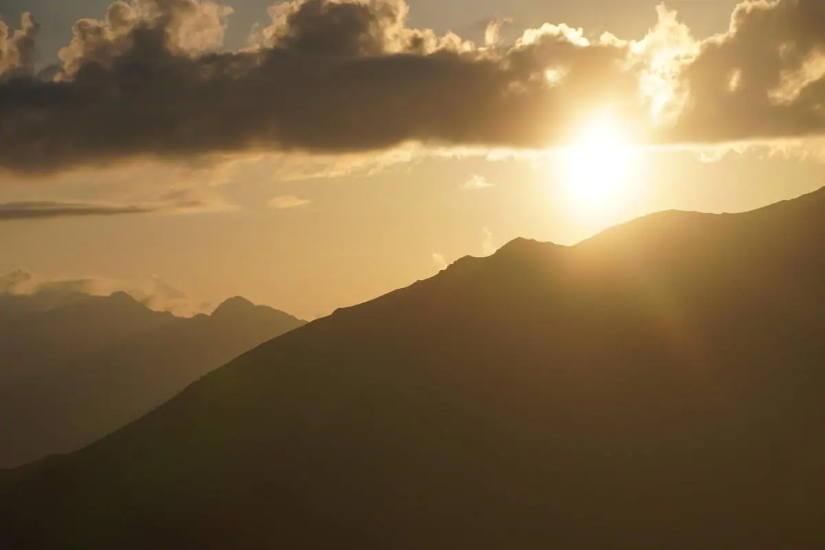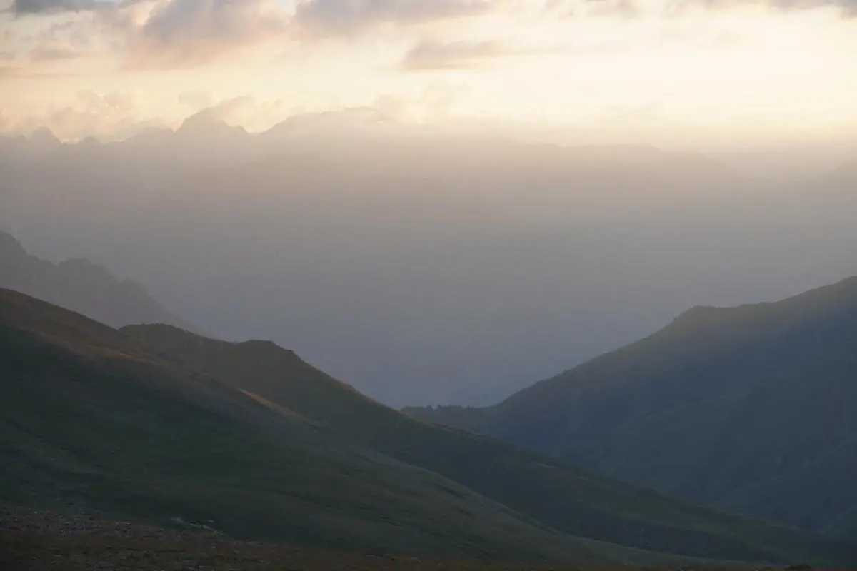 Вид с перевала Эпчик на закате. За секунды до захода Солнца