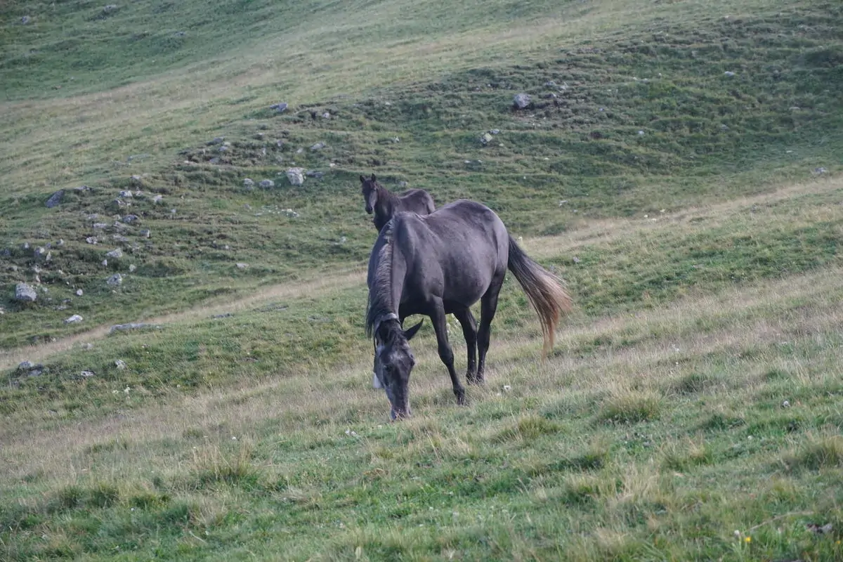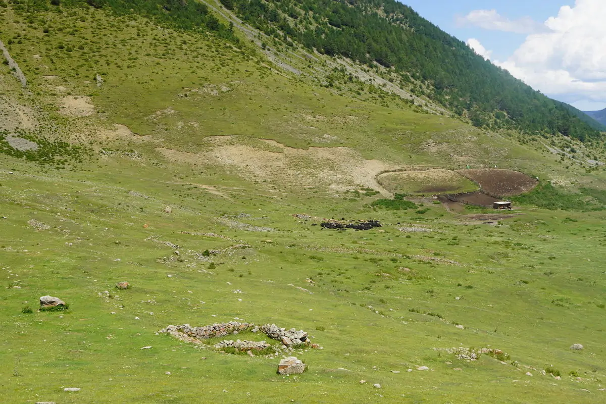 Второй - спускаться по накатанной через траву автомобильной дороге, которая ведет к кошаре на опушке. Эта дорога носит временный характер и может быть в разной степени накатанной в зависимости сезона, также нужно иметь в виду, что в этом случае есть вероятность встретить в кошаре охраняющих собак.