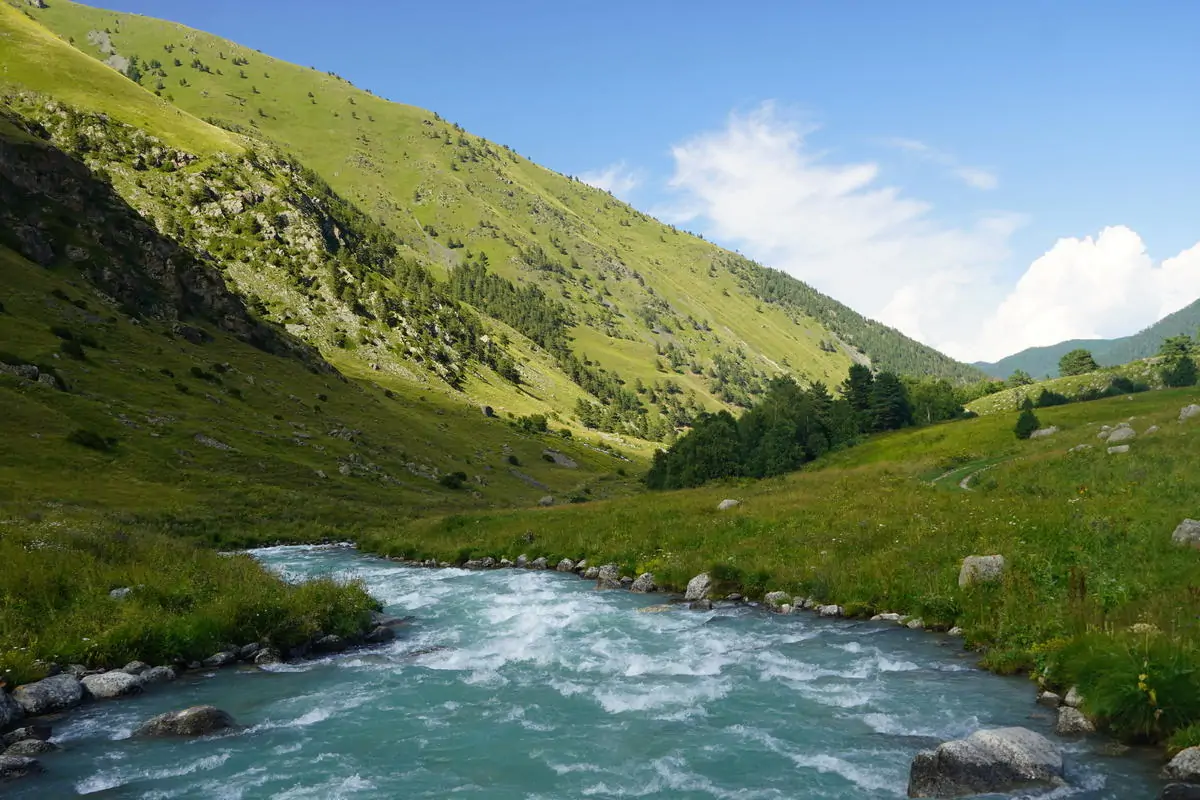 Перейдя через мост, нужно повернуть налево и идти вдоль старых домов до следующего слияния Даута с рекой Кенделлесу. Перед слиянием рек дорога уходит направо вверх в сторону перевала Эпчик.