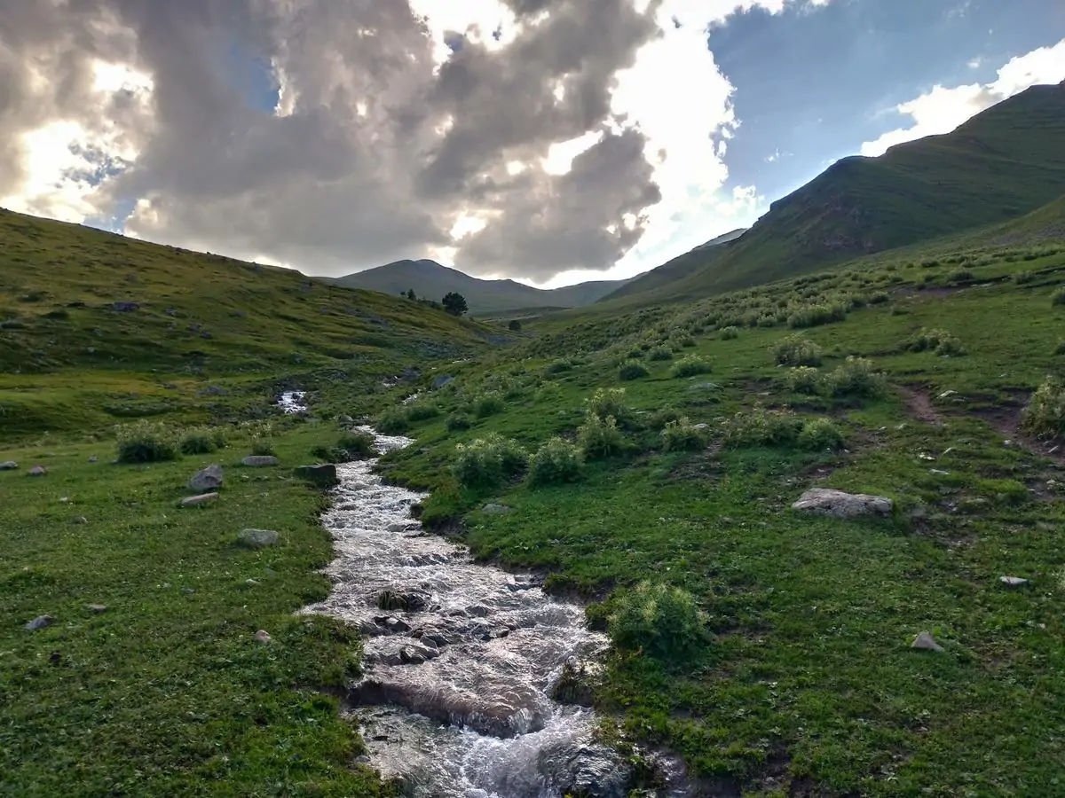 Спуск с перевала Эпчик в долину реки Эпчик к Джамагатским нарзанам проходит практически всё время по очень хорошей явной тропе до самых нарзанов. Если необходимо заночевать, то лучше это сделать выше пастбищ на открытой местности, немного ниже перевала, где вода в ручьях ещё чистая, а ниже не особо много мест для ночлега. С перевала до нарзанов примерно два часа ходьбы вниз, поэтому, располагая временем лучше спуститься и переночевать там. По пути вниз будет несколько бродов, самый широкий примерно на входе в зону леса, он не глубокий, но высоту ботинка местами скрыть сможет. Кроссовки с сеткой без мембраны быстро выведут воду, а вот ботинки с мембраной вряд ли, поэтому к прохождению этого участка стоит подобрать удобную обувь. В крайнем случае, брод можно перейти разувшись, но дно каменистое, нужно быть аккуратным, или использовать сланцы, если они у вас есть.