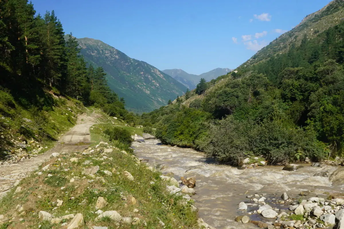 После нарзанов начинается спуск по дороге до аула Хурзук и Учкулан - до первого 20 километров пологого спуска по грунтовке, а до Учкулана 30 километров. На этом спуске можно почувствовать, как важны для таких походов кроссовки с хорошей амортизацией и мягким верхом. По пути в Учкулан можно увидеть воды реки Кубань, которая берёт начало от самого Эльбруса. В самом Хурзуке мы не нашли места для ночлега, которые можно было бы забронировать заранее, как и в Учкулане. Поэтому, если окончание маршрута предполагается именно здесь, то переночевать можно около слияния рек Еникол и Уллу-Хурзук, а утром дойти до Учкулана или Хурзука, откуда отправиться назад в цивилизацию.