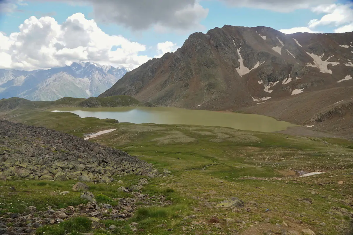 От озера остаётся набрать всего 250 метров до перевала Сылтран. С его высоты в 3440 метров в хорошую погоду открывается великолепный вид на озеро и окружающие скалистые хребты. Теперь предстоит продолжительный сброс высоты, в середине которого (14,6км от начала маршрута) есть техничный участок - спуск по крутой обрывистой тропе. В непогоду опасность поскользнуться существенно возрастает и нужно быть особо внимательным. Обойти эту полку можно слева у реки Мкяра, но уже без тропы. Далее трек идет вдоль реки Кыртык, выводя к деревянному мосту (17,1км), перед которым есть удобное место для ночёвки.