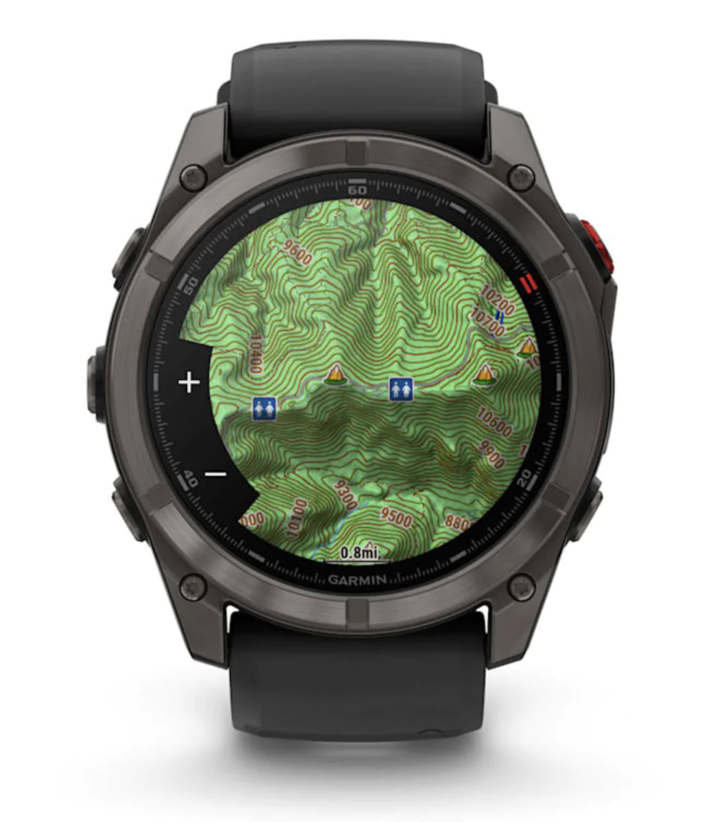 В отличие от серии Peak, здесь нет упора на минималистичность — Suunto Race 2 обладают приличным экраном с подсветкой AMOLED и весят 76 г. Чуть большие габариты позволили добавить в часы офлайн карты, и с высоким разрешением дисплея читать их не станет проблемой. Из интересных нюансов — новый формат кнопки, благодаря которой можно быстро прокручивать значения на экране. Кажется, такое мы уже где-то видели, но для Suunto это действительно впервые. Время работы батареи зависит от ваших целей — для тренировок и соревнований можно выбрать «Результативность», и это будет 55 ч, а для похода есть режим «Путешествие» — 200 ч с включенным GPS и пульсометров.