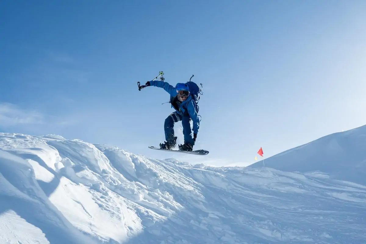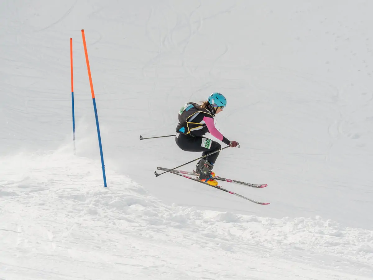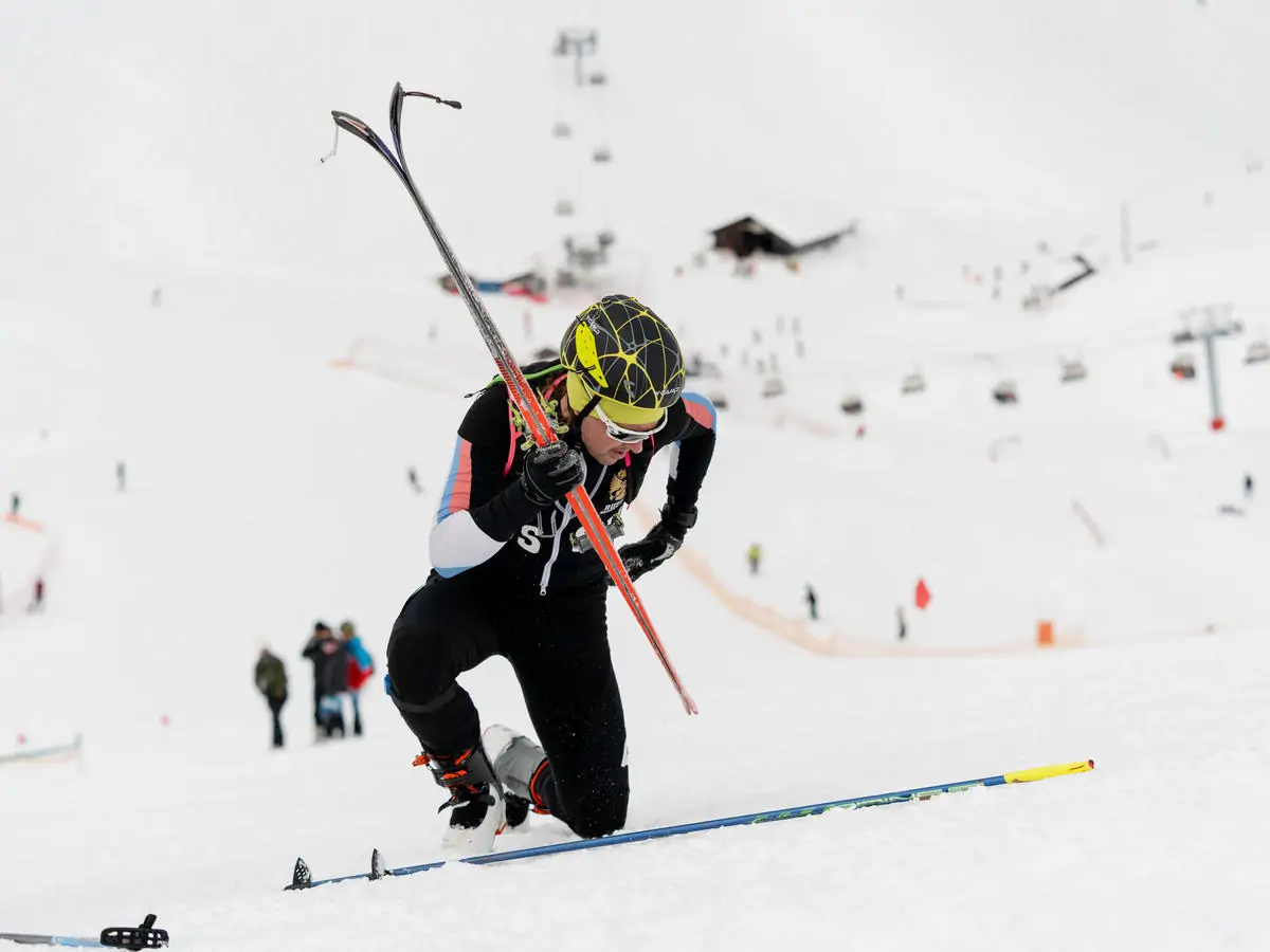 Подъем на лыжах происходит на камусе — это специальная накладка на скользящую поверхность лыжи, с одной стороны с клеевым слоем, с другой с шерстью, которая позволяет подниматься наверх. А перед спуском она снимается (очень быстро!), и спортсмен отправляется вниз.