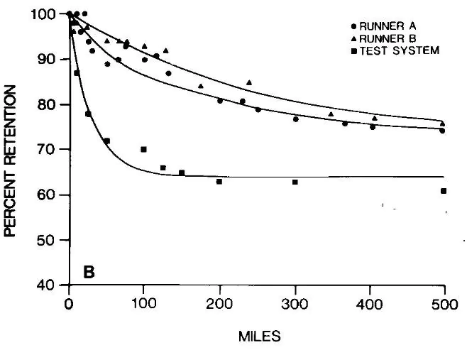 Машинная версия бега, очевидно, не очень хорошо воспроизводит человеческий бег, но анализ обуви двух добровольца показал схожие закономерности. В целом, испытания на людях показали, что обувь сохраняет около 80% амортизации после 250 км и 70% после 800 км. На рисунке видно, что кривая амортизации выходит на плато на отметке между 500 и 800 км (300 и 500 миль), и, по-видимому, именно отсюда и вытекает общепринятый совет о сроке службы обуви. И наоборот, можно утверждать, что как только атлет набегает в обуви 500 км, амортизация уже не будет падать, поэтому вы можете продолжать бегать в этой же паре кроссовок, пока они окончательно не развалятся. Подробнее об этом ниже.
