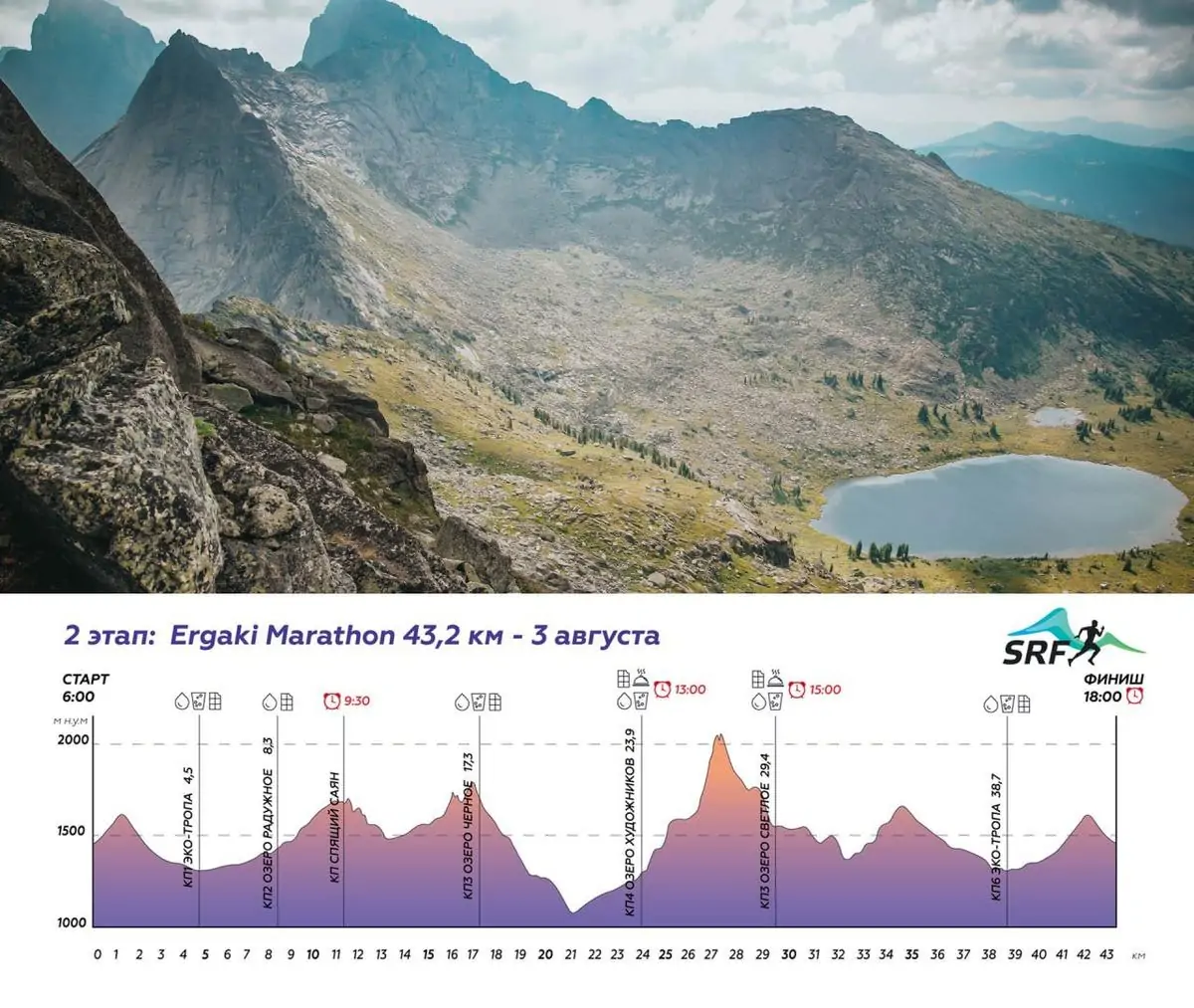 2 этап. «Ergaki Marathon»: 43.2 км. с набором высоты – 2700+ метров. Маршрут через Висячий камень, озеро Каровое, перевал Художников, перевал Молодежный, перевал Курсантов, озеро Мраморное, перевал Птица с видами на знаменитую Параболу и озеро Горных духов, а также через озеро Художников и перевал Тайгиш-2