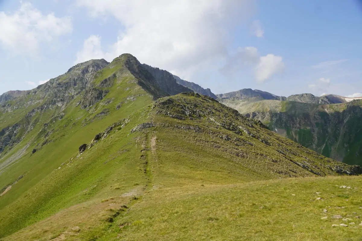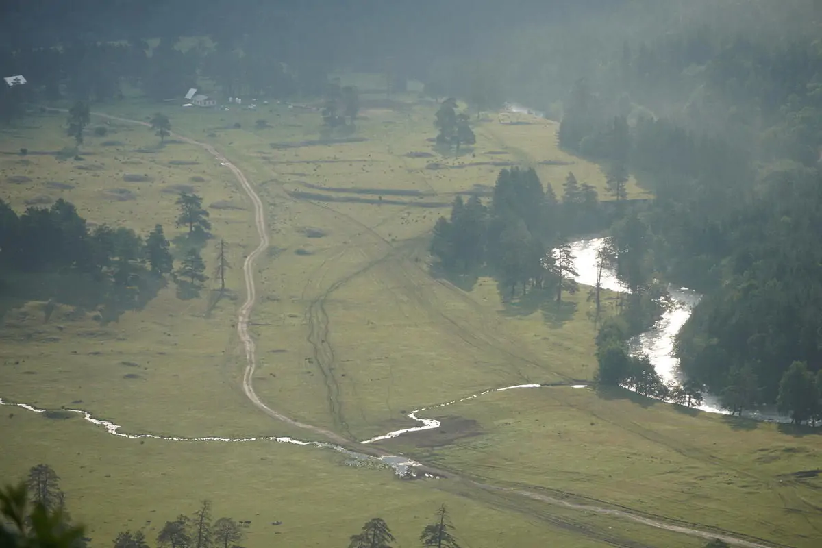 В момент выхода из леса на подъёме дорога заканчивается и она не слишком явно переходит в тропу. Генерально нужно двигаться вверх к перевалу по треку, или слегка отходя от него, делая “ёлочку”, как будет удобнее. Здесь опять же много пересечений маршрута с козьими тропами, которые могут казаться полноценными тропами, но все они идут поперёк маршрута на перевал. Просто двигайтесь вверх и в конечном счёте тропа вновь будет идти уже на перевал.