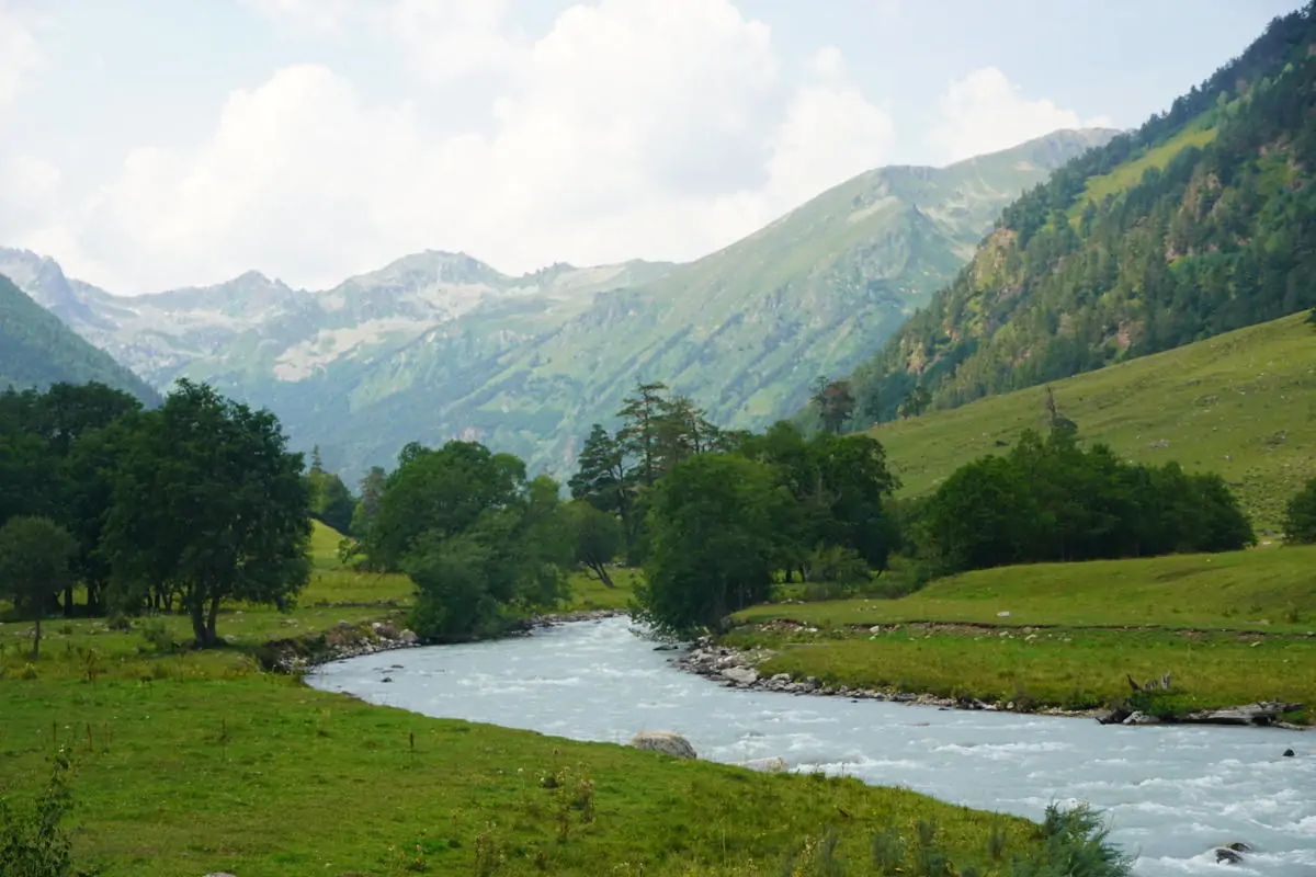 Маршрут из Теберды в Архыз начинается ровно там, где вы решили заночевать в Теберде. Фактическим началом можно считать вход в ущелье Муху от дороги на Домбай (Карачаевская улица, дом 31, сразу за автобусной остановкой). По началу среди жилых домов и гостиниц есть немного крутой пригорок с набором около 60 метров, затем короткий спуск всего на 10 метров и начинается само ущелье и долина реки Муху. Первые пару километров дорога идёт слева от реки вдоль баз отдыха, затем по широкому мосту выполняется переход на противоположную сторону (левый берег) и река остаётся справа на долгое время.