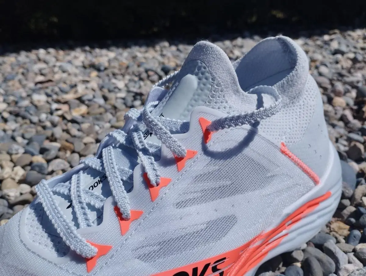 Верх выполнен из жесткой гидрофобной однослойной сетки очень напоминающей Matryx, но это не он. Есть предположение о высокой износоустойчивости данного материала, что обнадеживает - это могло бы создать конкуренцию и альтернативные решения. Также интересным решением являются ламинированные оранжевые полосы для усиления и плотности посадки. Кто-то из разработчиков Brooks явно любит контроль и фиксацию, даже больше, чем сами горные атлеты).